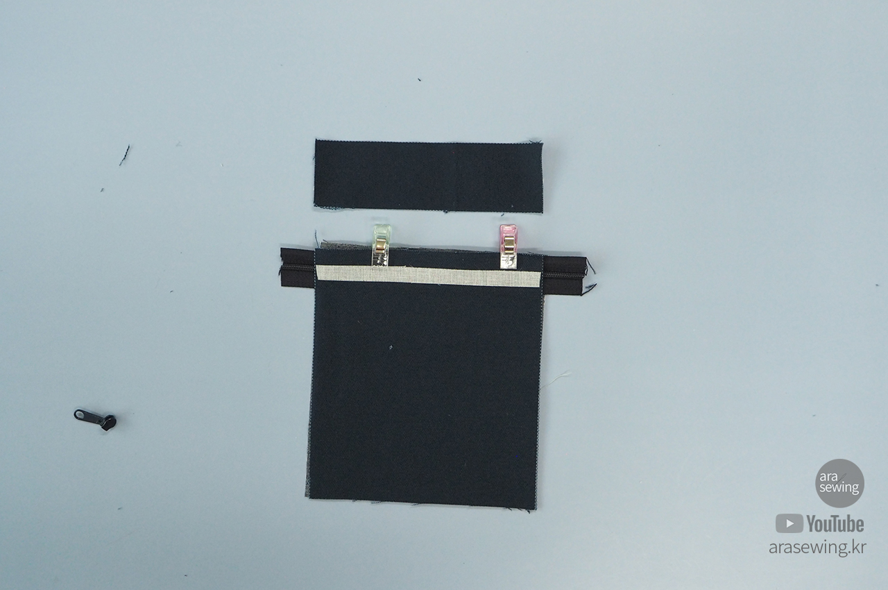 지퍼 위 덧대는 천도 지퍼에 박음질로 연결합니다.