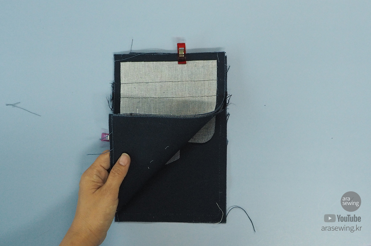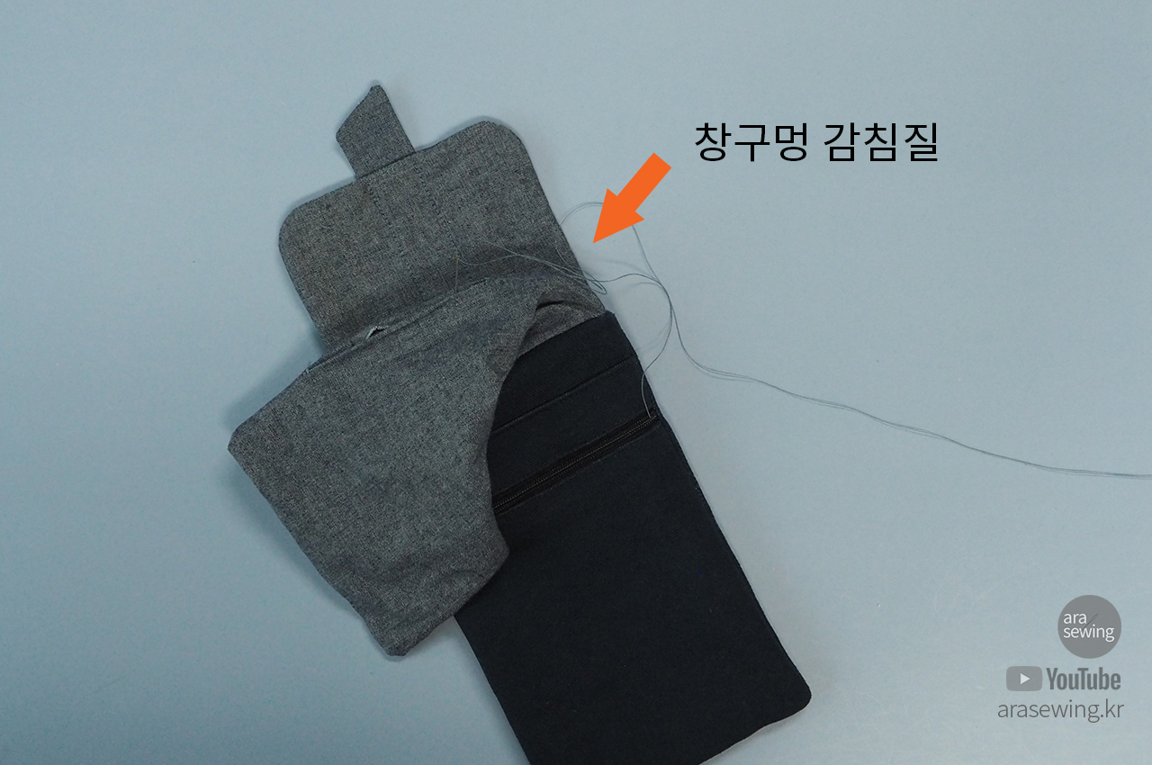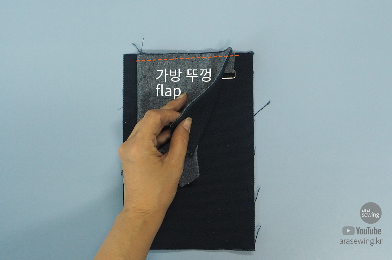 가방 뚜껑을 그 위에 겉면을 대고 박음질로 고정합니다.