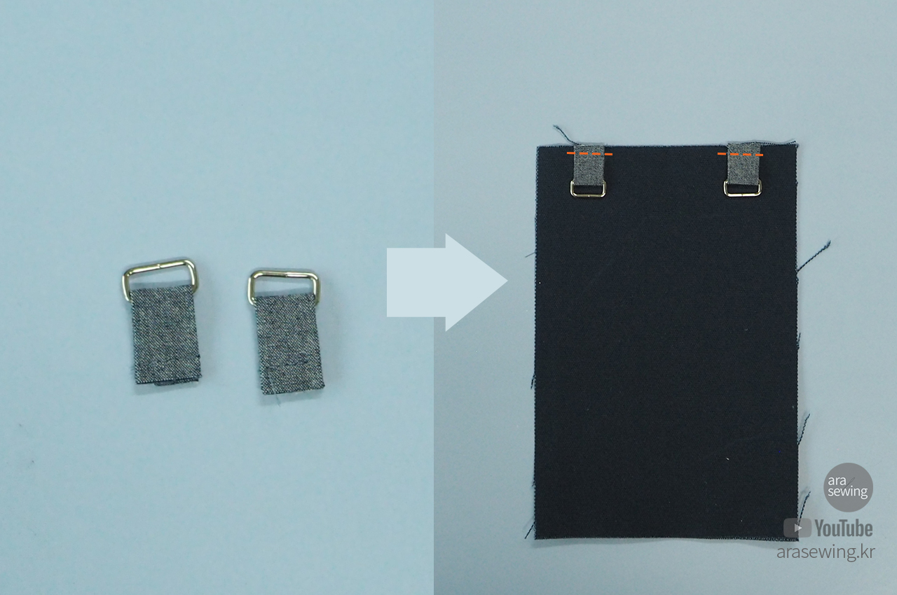 끈을 연결할 고리를 만들어서 링을 연결하여 박음질한 후에 뒤판 겉면에 고정합니다.