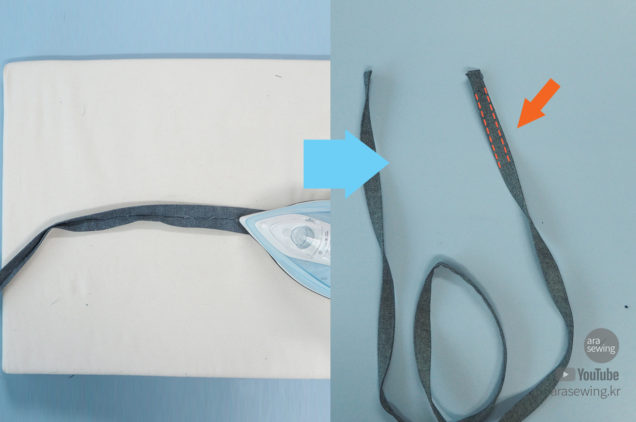 ※ 동영상을 보면 끈 만드는 과정에 접착 심지 테이프를 사용합니다. 테이프를 붙이면 힘을 받아서 늘어지지 않게 하려던 거였고요, 끈을 식서 방향으로 안 하고 푸서 방향으로 재단했기 때문에 붙였습니다. 식서 방향으로 재단하였다면 꼭 붙이지 않아도 됩니다. 물론 심지를 붙이는 게 더 힘이 들어가서 늘어지지 않고 견고 합니다. 원단에 두께에 따라서도 선택사항입니다.
