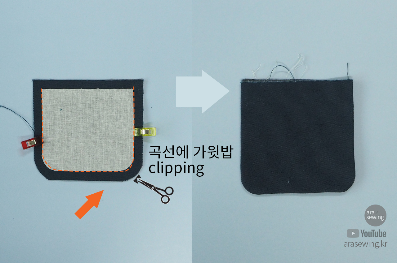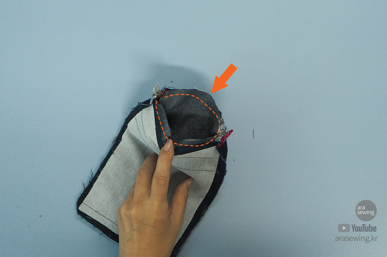 가방 뚜껑을 박음질하고 다림질로 모양을 잡아서 준비합니다. 이때 시접의 여분을 잘라내고 곡선 부분에 가윗밥을 주고 뒤집어야 곡선이 잘 나옵니다.