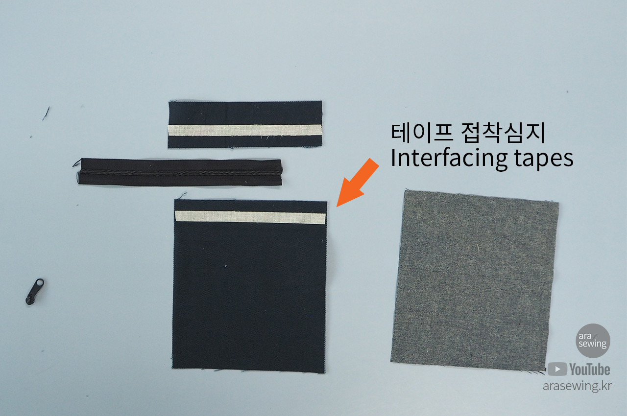 앞 지퍼 주머니 감 지퍼가 달릴 부분에 봉제 시에 늘어나지 않도록 접착 심지 테이프를 붙입니다.