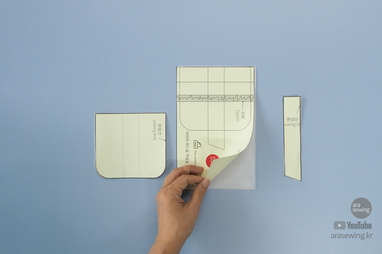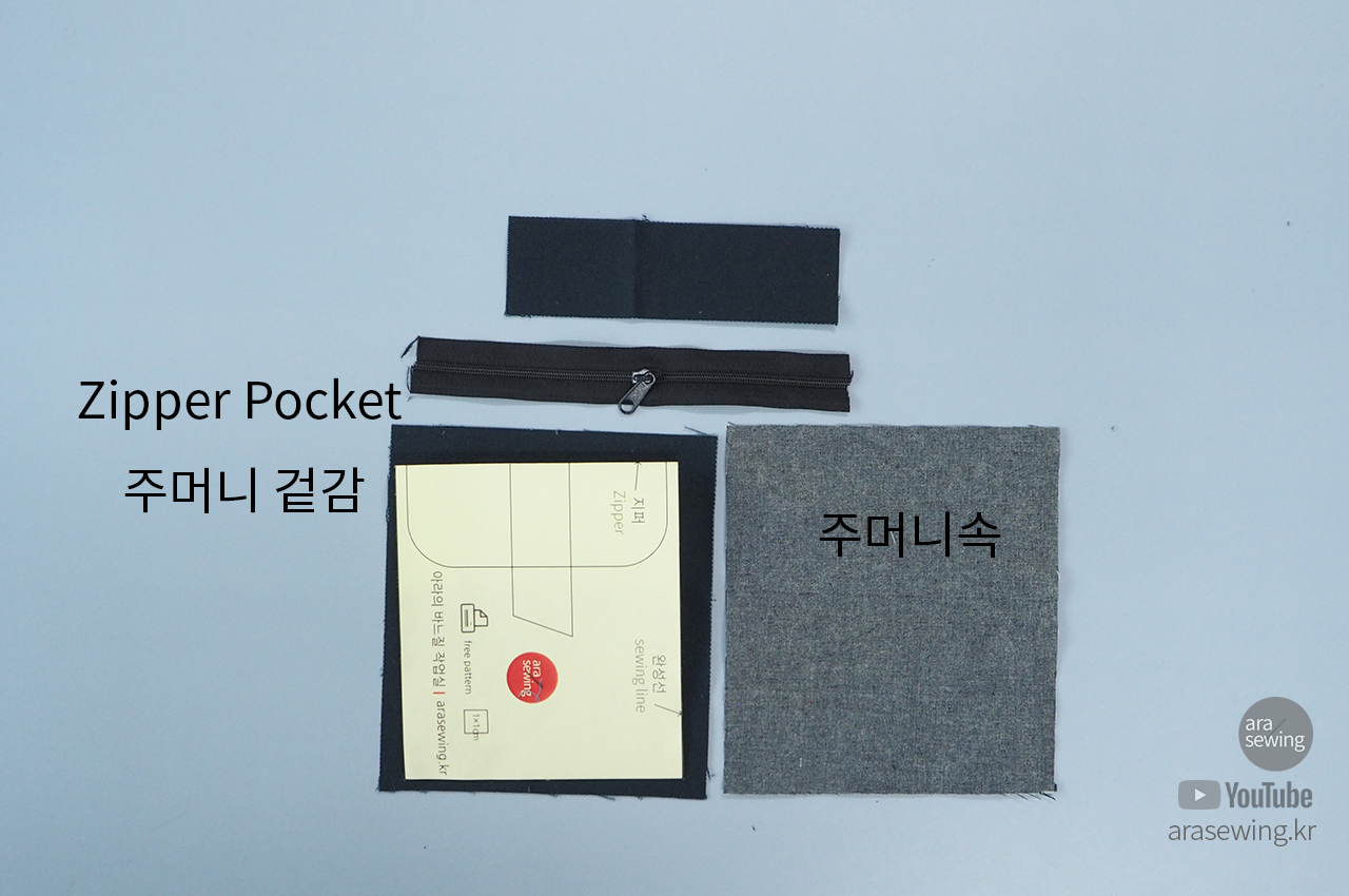 그 위에 지퍼 주머니가 달린 앞판의 겉면을 대고 잘 맞춥니다.