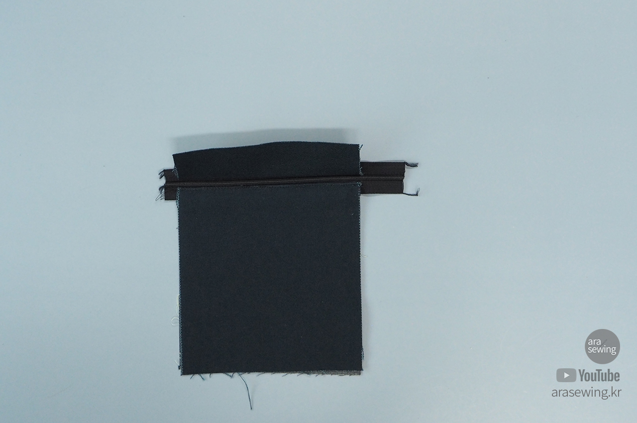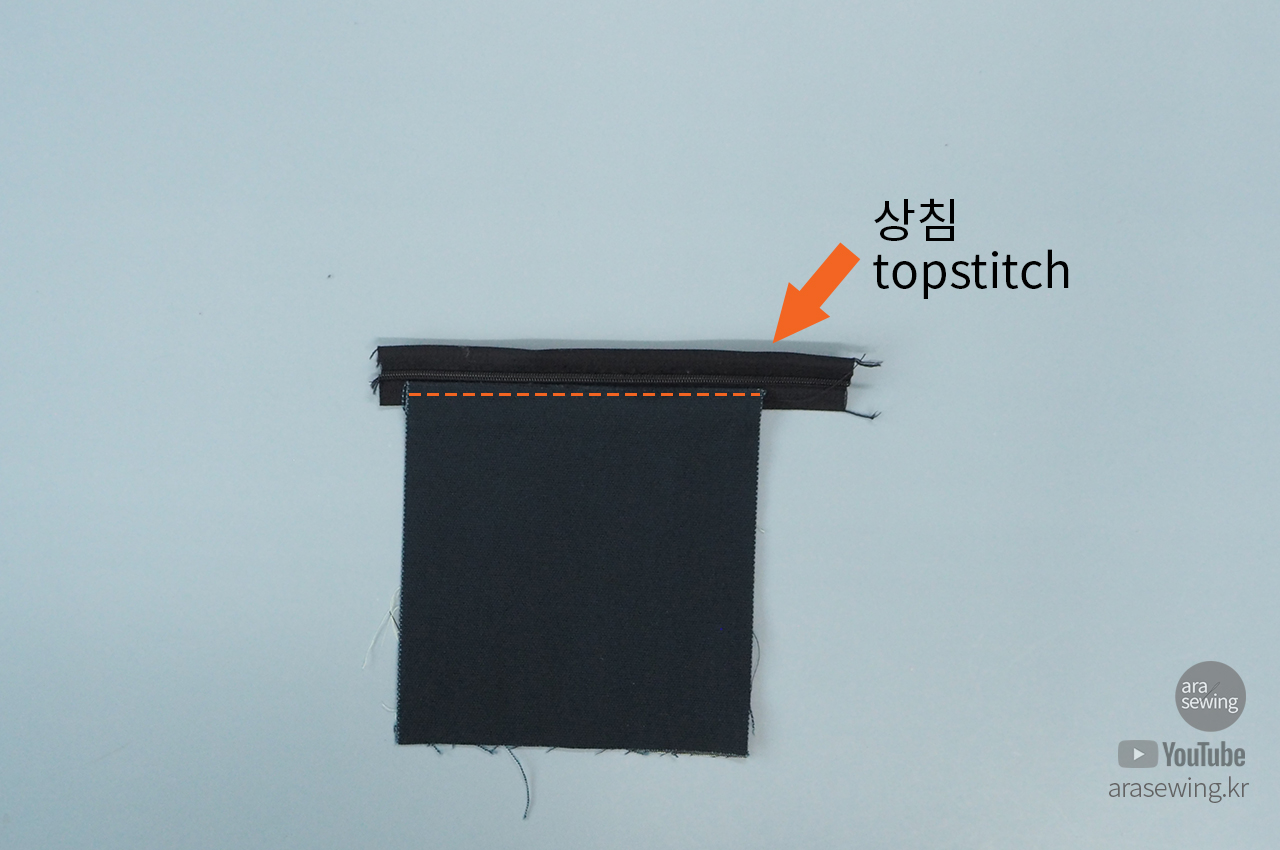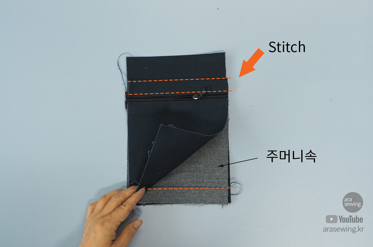 지퍼 위 덧대는 천도 지퍼에 박음질로 연결합니다.