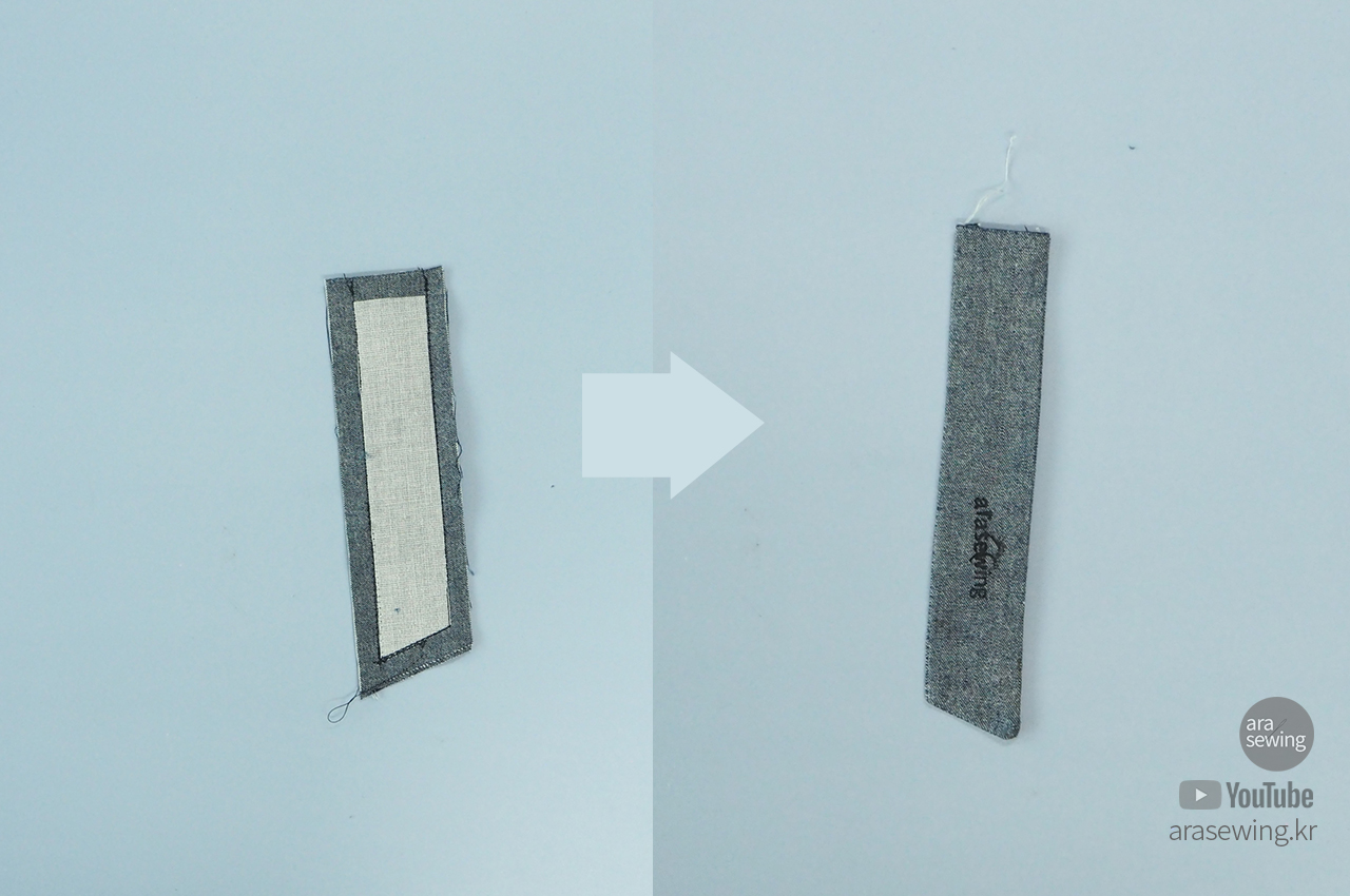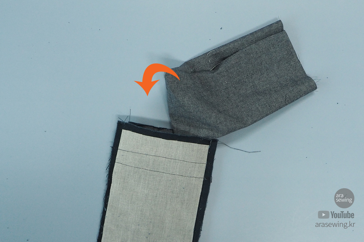안감을 뒤집어서 겉면이 나오게 한 뒤에 겉감의 겉과 마주 보게 하여 집어넣어 겹칩니다.