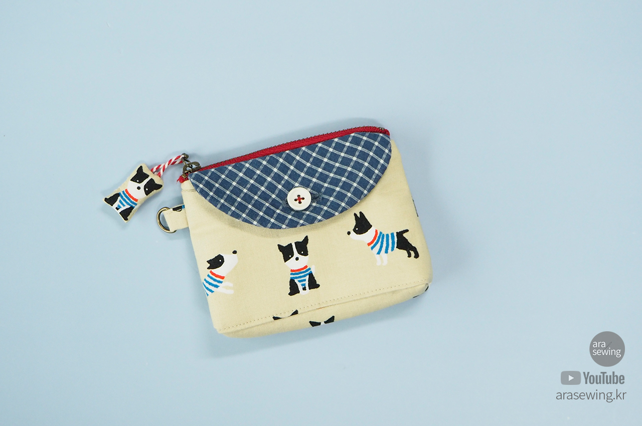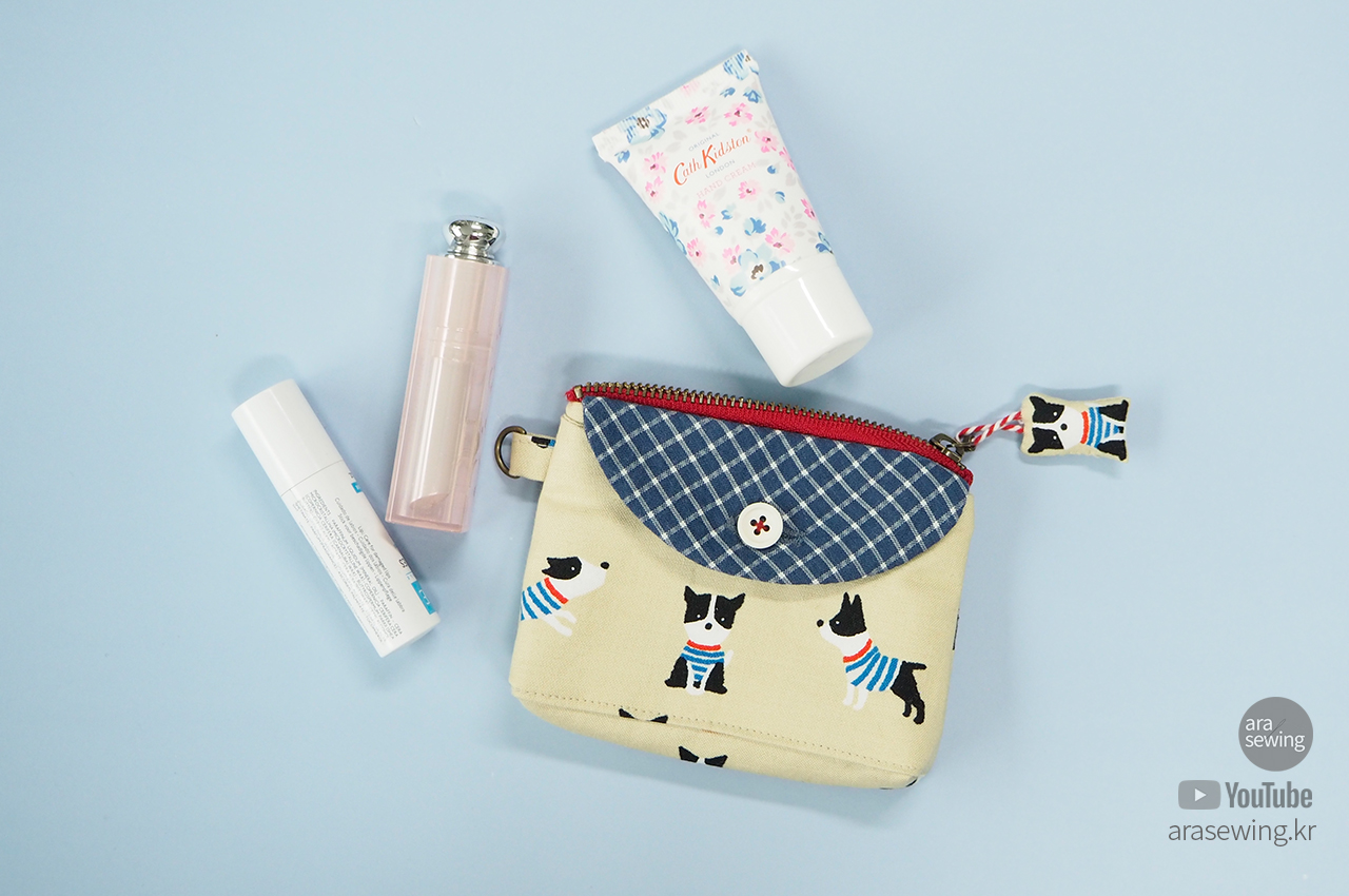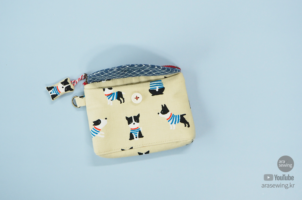 손안에 들어오는 작은 파우치입니다. 앞 주머니에는 카드나 영수증 등을 넣을 수 있고, 엔틱 지퍼를 달았어요. 원래 코일 지퍼를 주로 사용하는데 이 원단이나 색감이 쇠 지퍼가 어울릴 것 같았습니다. 겉감의 귀여운 강아지 패턴이 너무 귀여워서 이 원단을 보자마자 뭔가 작은 소품을 만들고 싶었죠. 옆선에 고리를 달아서 가방 등에 걸 수도 있고, 겉감의 캐릭터를 이용한 지퍼 슬라이더를 만들었어요. 작은 usb 나 맆스틱 등을 보관하기에 좋습니다.