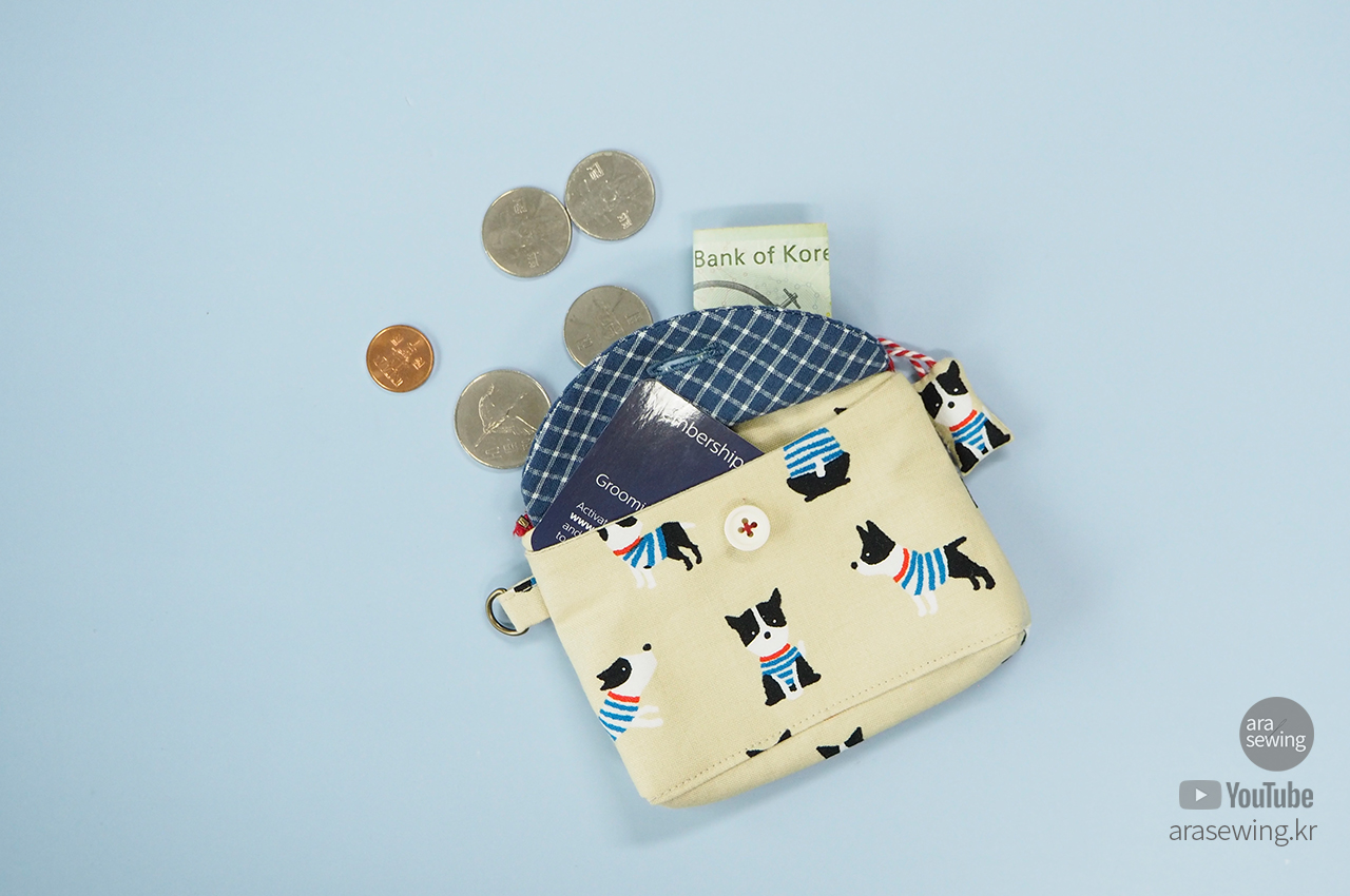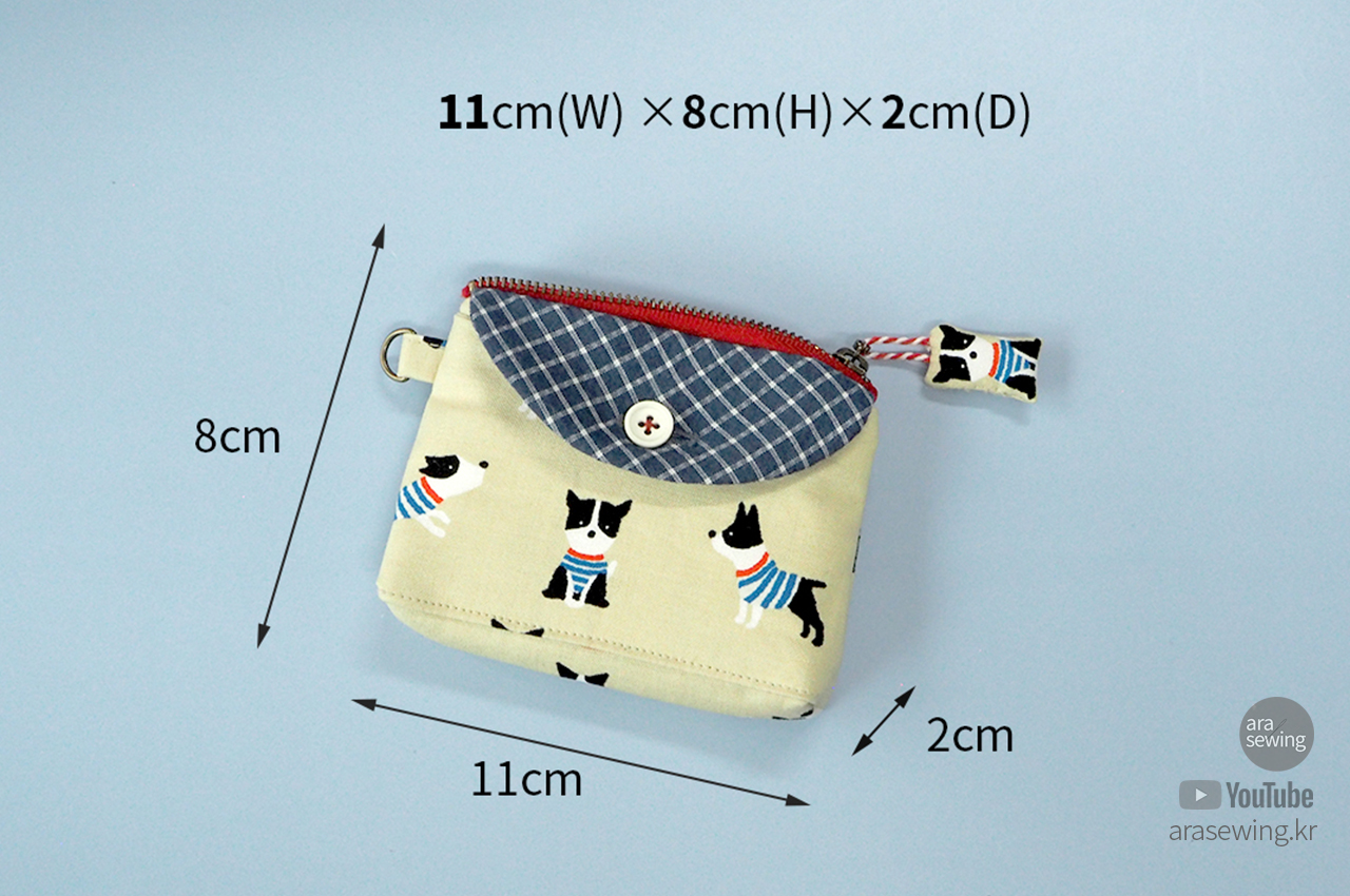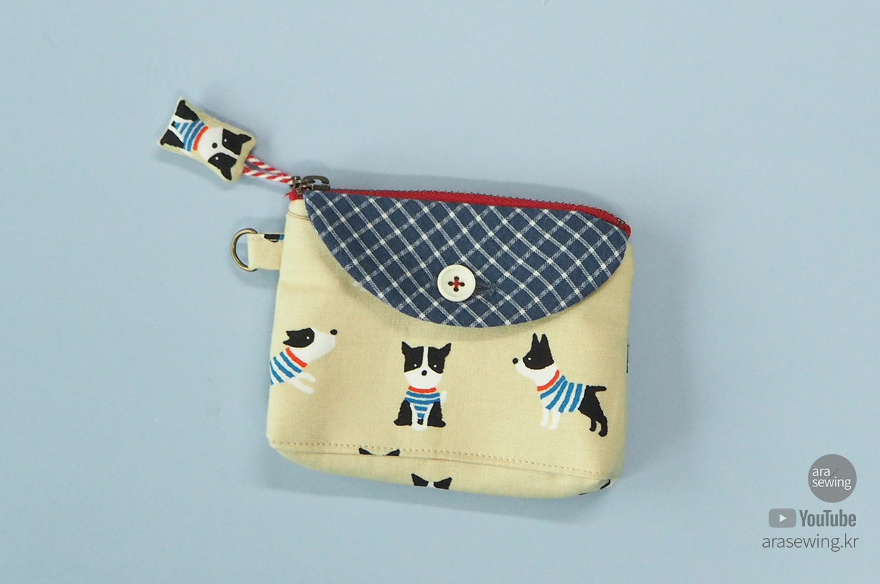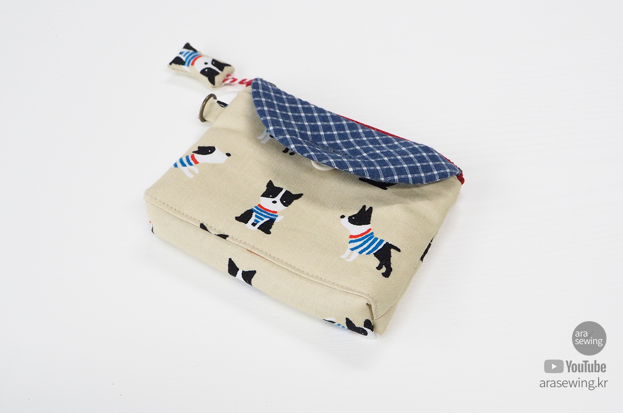 손안에 들어오는 작은 파우치입니다. 앞 주머니에는 카드나 영수증 등을 넣을 수 있고, 엔틱 지퍼를 달았어요. 원래 코일 지퍼를 주로 사용하는데 이 원단이나 색감이 쇠 지퍼가 어울릴 것 같았습니다. 겉감의 귀여운 강아지 패턴이 너무 귀여워서 이 원단을 보자마자 뭔가 작은 소품을 만들고 싶었죠. 옆선에 고리를 달아서 가방 등에 걸 수도 있고, 겉감의 캐릭터를 이용한 지퍼 슬라이더를 만들었어요. 작은 usb 나 맆스틱 등을 보관하기에 좋습니다.