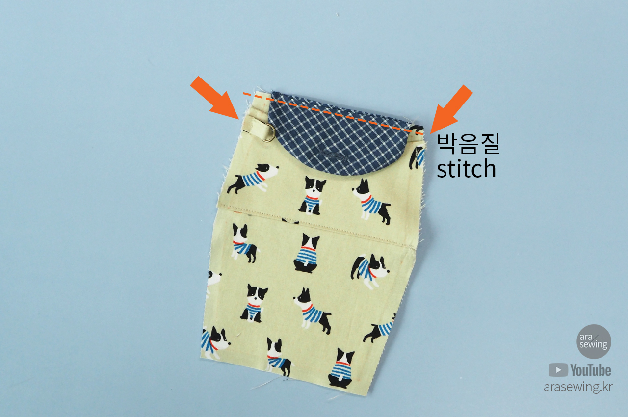 뚜껑을 중심을 맞추어 겉 몸판에 시접 부분에 박음질로 고정합니다. 옆 선에 D링을 단 고리를 만들어 고정합니다.