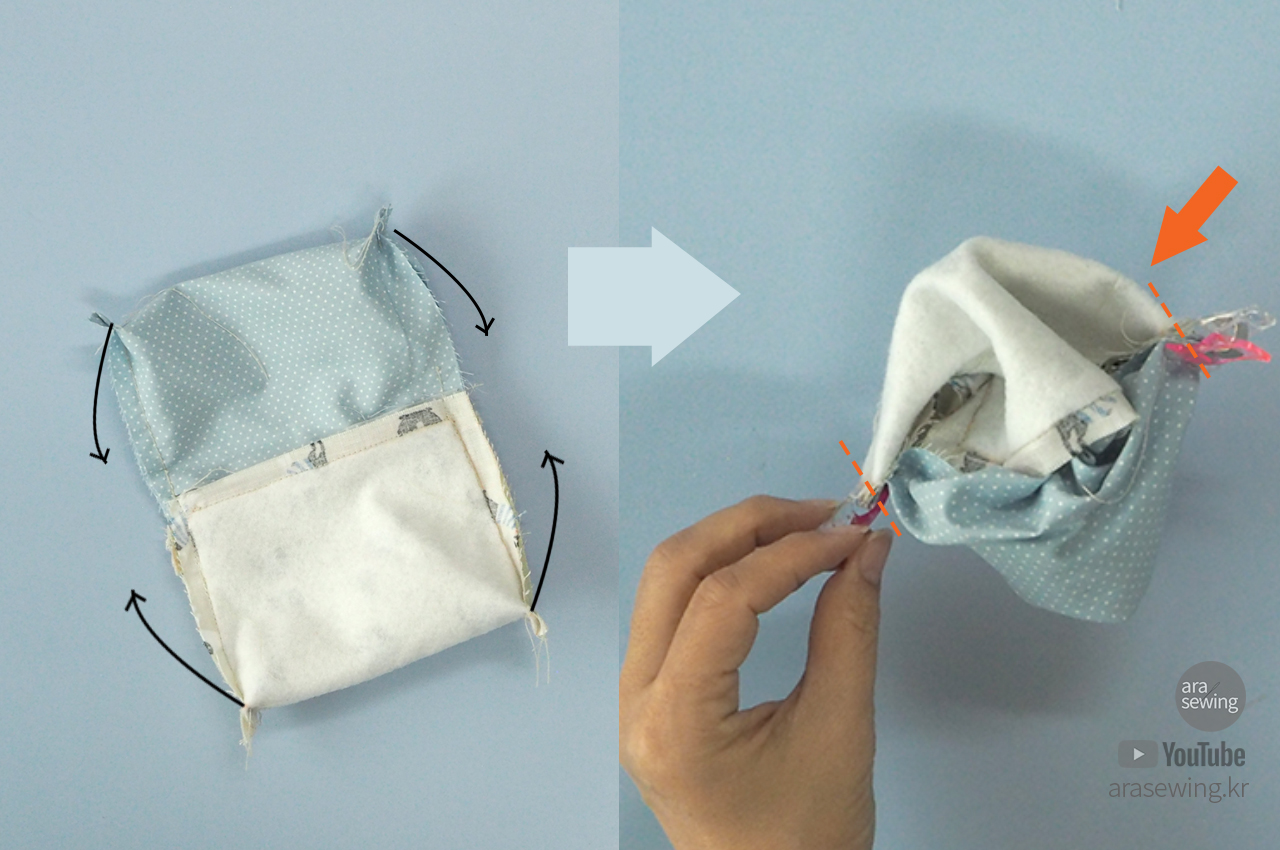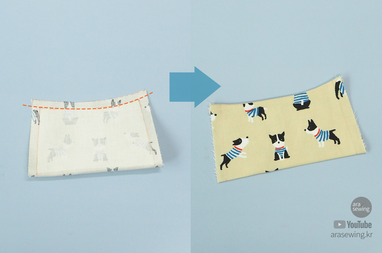 앞 주머니 감을 겉끼리 대고 반으로 접어서 윗 부분을 박음질합니다. 여분의 시접을 정리하고 가위밥을 준 후에 뒤집어서 모양을 잡아서 준비합니다. 다림질로 정리하는게 좋습니다.