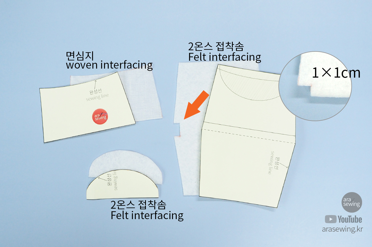 겉감에 붙일 접착 솜과 뚜껑에 붙일 면 심지를 준비하여 재단합니다. 주머니감은 접착솜을 붙이면 두꺼운 느낌이라 면심지를 사용했어요. 접착 솜의 느낌이 좋다면 그대로 사용해도 됩니다. 이때 몸판 겉감을 재단한 후에 중심선을 반으로 접어서 1 ×1cm로 잘라냅니다. 솔기 선의 솜의 두터운 느낌이 괜찮다면 이 작업은 생략해도 됩니다.