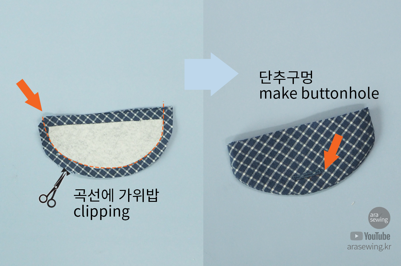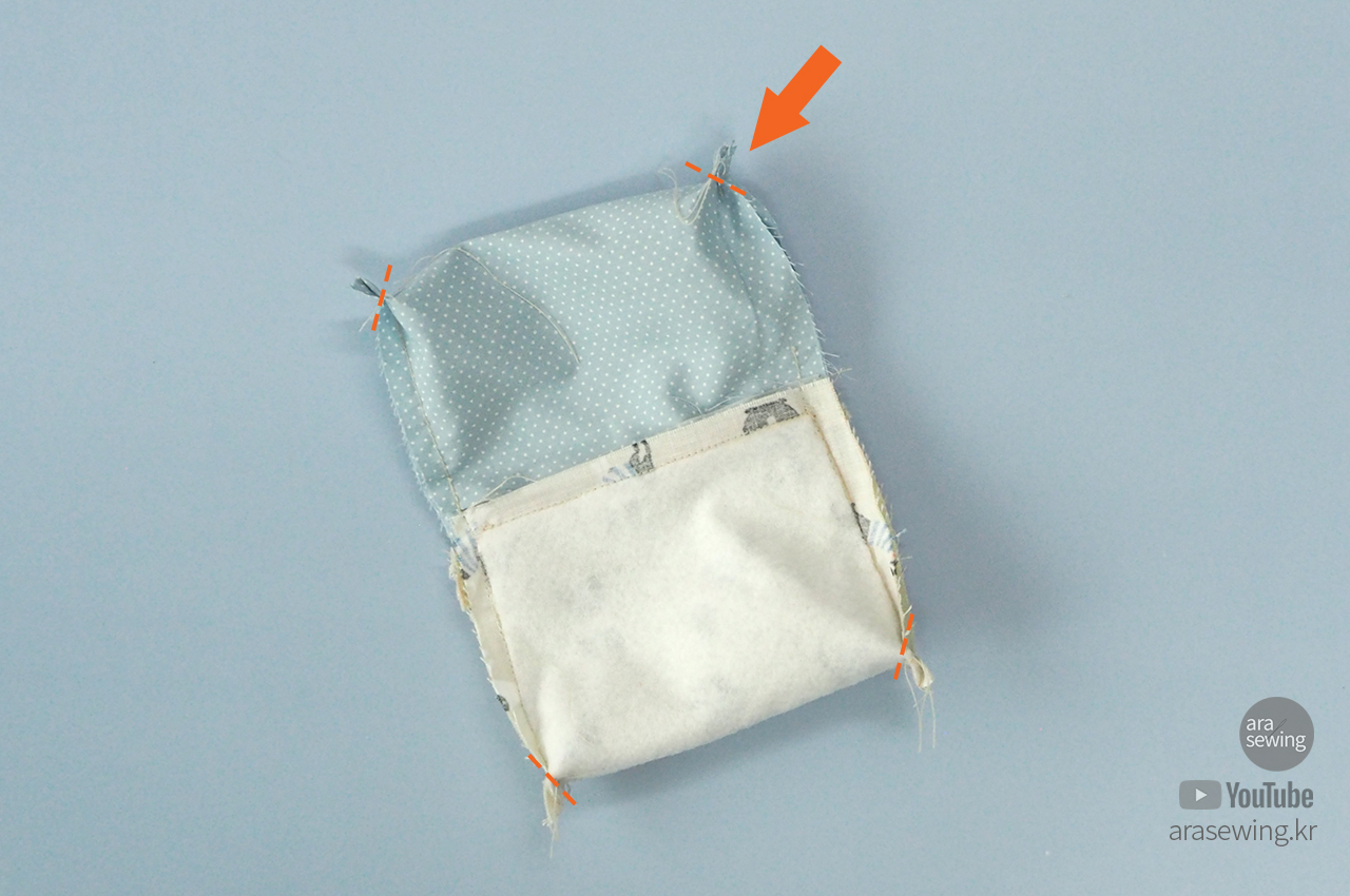 뚜껑을 만들어서 준비합니다. 앞 주머니와 똑같이 곡선 부분은 시접을 정리하고 가위밥을 준 후에 뒤집습니다. 단춧구멍 위치를 표시하고 단추 구멍을 만듭니다.