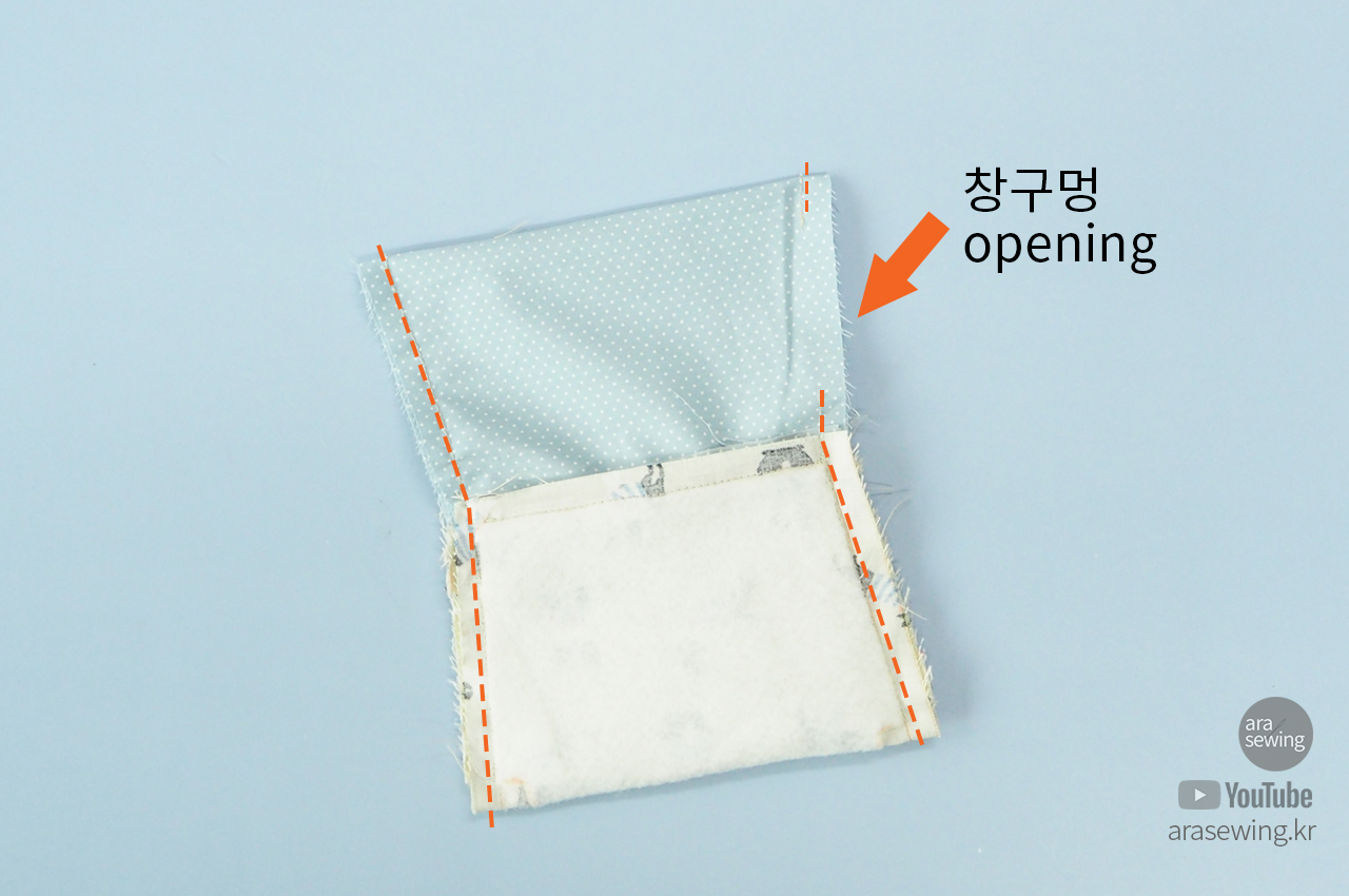 겉감은 겉감끼리, 안감은 안감끼리 마주 보게 하고 안감에 창구멍을 남기고 옆선을 박음질합니다.