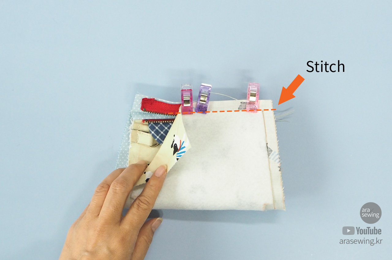 지퍼의 뒷면을 겉감의 겉에 대고 그 위에 안감을 올리고 잘 맞추어 박음질합니다.
