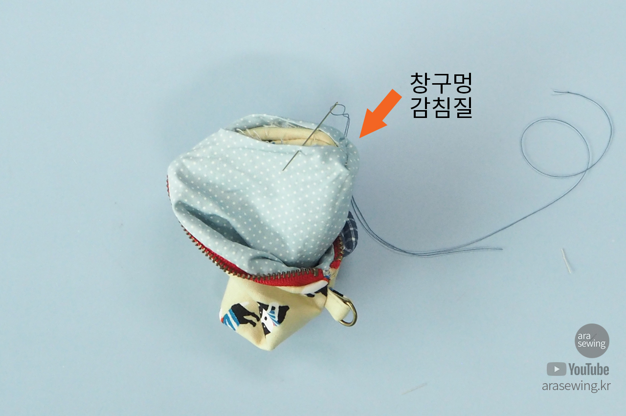 감침질로 창구멍을 마감합니다.