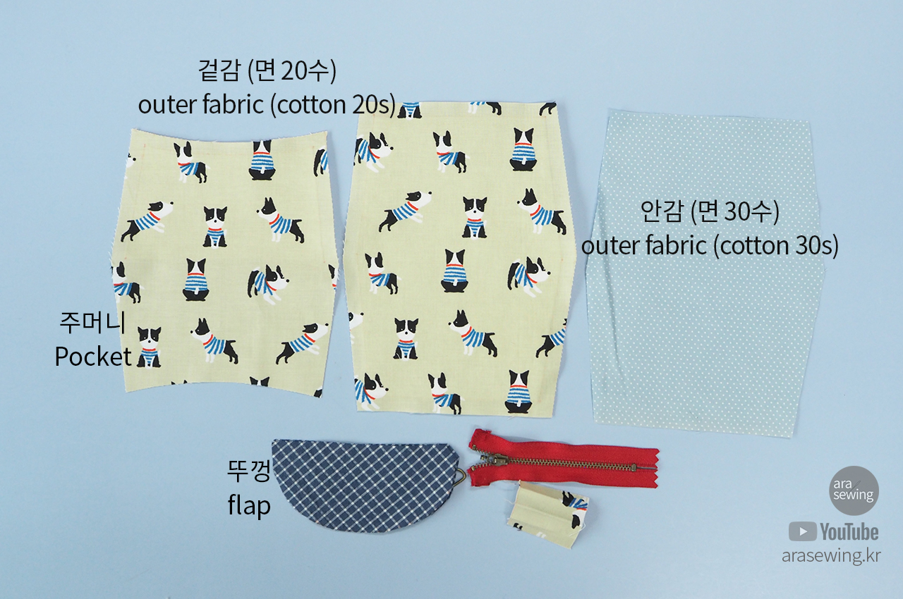 시접을 1cm로 주고 재단합니다. 이때 앞 주머니 감은 밑변을 연장하여 반으로 접을 수 있는 상태로 재단합니다.