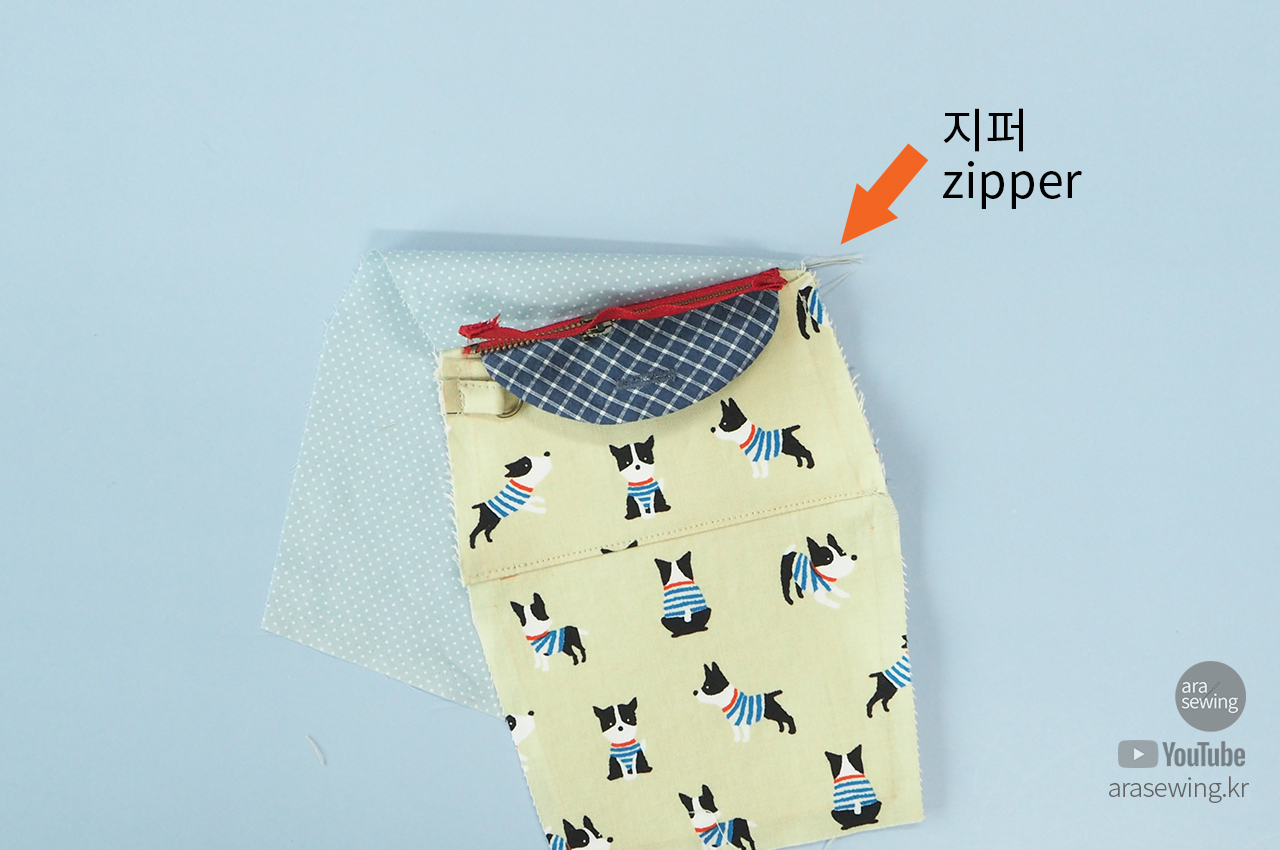맞은편 겉감과 안감을 지퍼에 대고 같은 방법으로 박음질합니다.