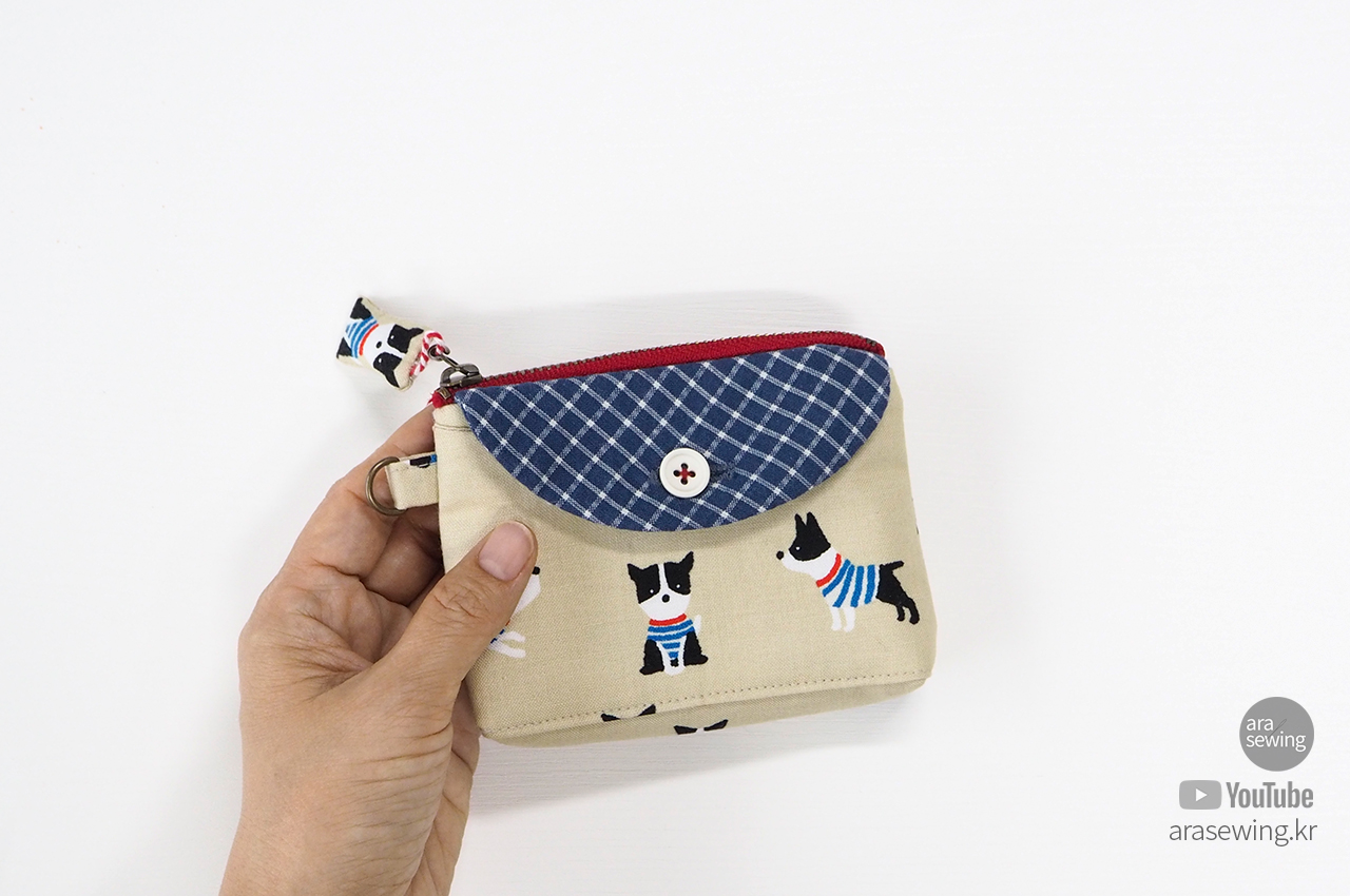 손안에 들어오는 작은 파우치입니다. 앞 주머니에는 카드나 영수증 등을 넣을 수 있고, 엔틱 지퍼를 달았어요. 원래 코일 지퍼를 주로 사용하는데 이 원단이나 색감이 쇠 지퍼가 어울릴 것 같았습니다. 겉감의 귀여운 강아지 패턴이 너무 귀여워서 이 원단을 보자마자 뭔가 작은 소품을 만들고 싶었죠. 옆선에 고리를 달아서 가방 등에 걸 수도 있고, 겉감의 캐릭터를 이용한 지퍼 슬라이더를 만들었어요. 작은 usb 나 맆스틱 등을 보관하기에 좋습니다.