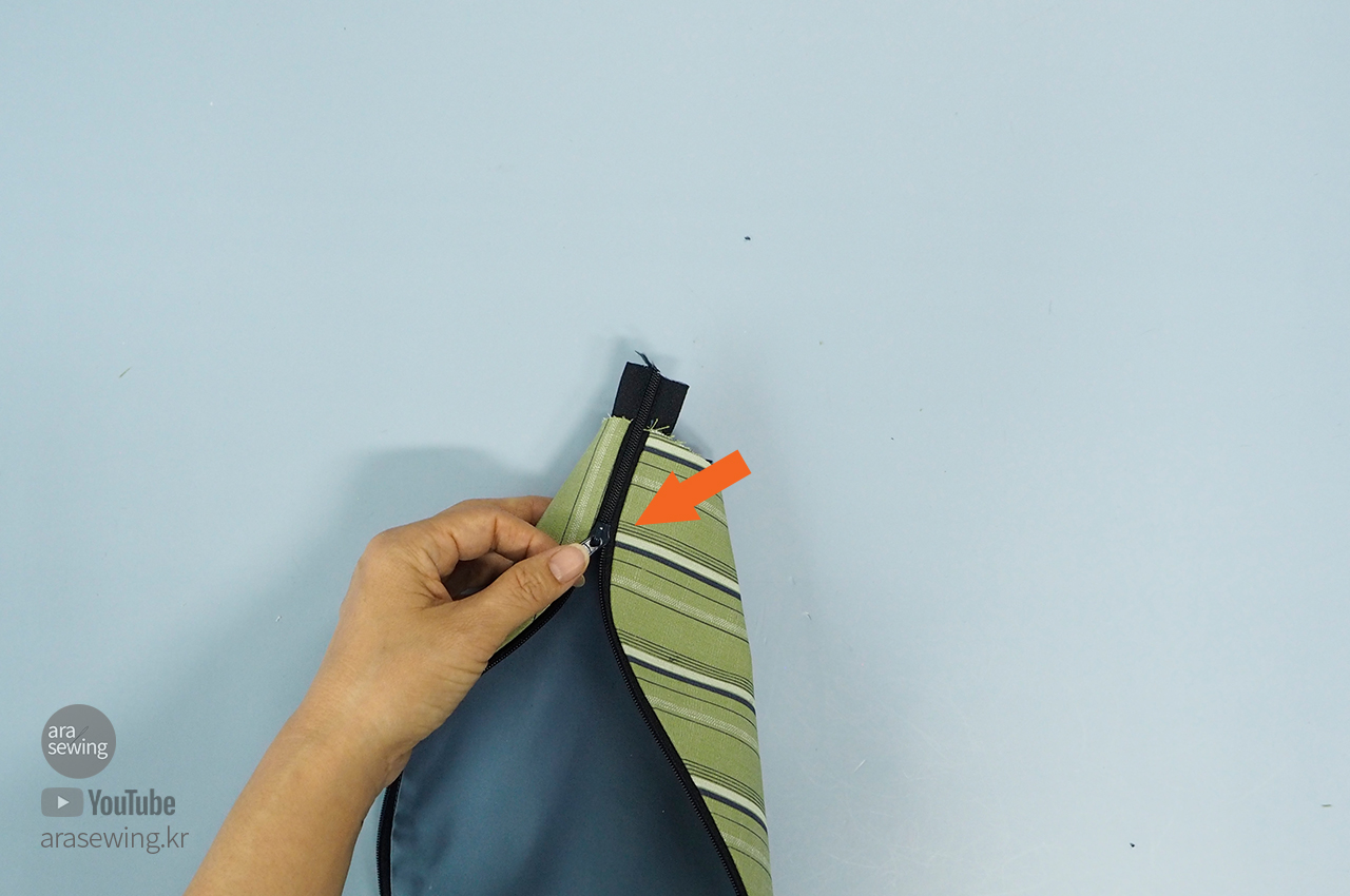 안쪽이 나오게 다시 뒤집습니다. 이때 양쪽 지퍼 이빨이 벌어지지 않게 조심해서 뒤집습니다. 지퍼 이빨 중간에 손바느질로 고정하고 하는 것도 좋아요.