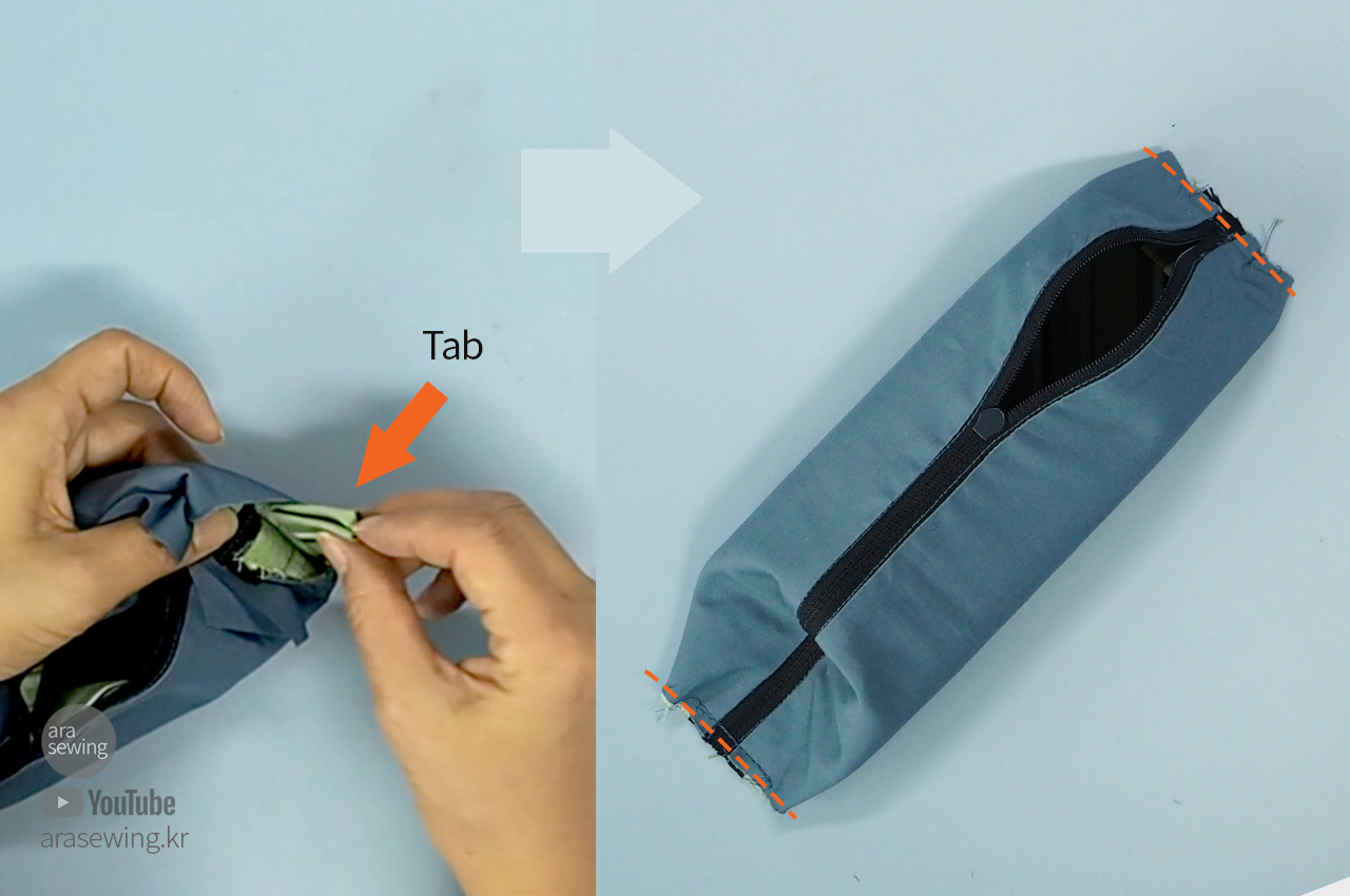 지퍼가 닫히는 방향으로 필통 끝에 끼울 텝을 만들어 고정하고 양쪽을 박음질로 고정합니다.