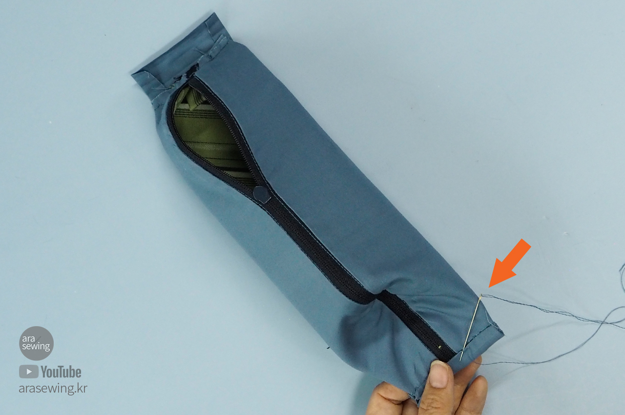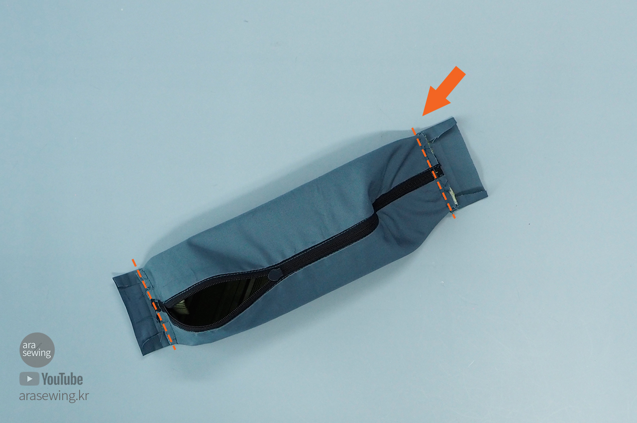 지퍼가 닫히는 방향으로 필통 끝에 끼울 텝을 만들어 고정하고 양쪽을 박음질로 고정합니다.
