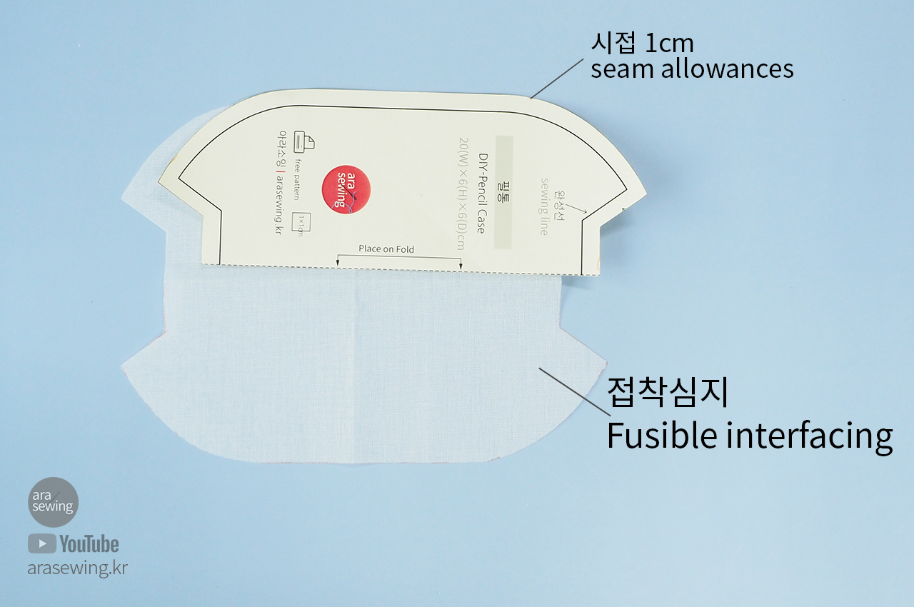 동영상에 나오는 설명처럼 패턴을 그리거나 다운로드하여 프린트합니다. 접착 심지를 재단합니다. 접착심지는 가방용 3t를 사용하였는데 적당한 단단함이 필통에 딱 어울리는것 같아요.