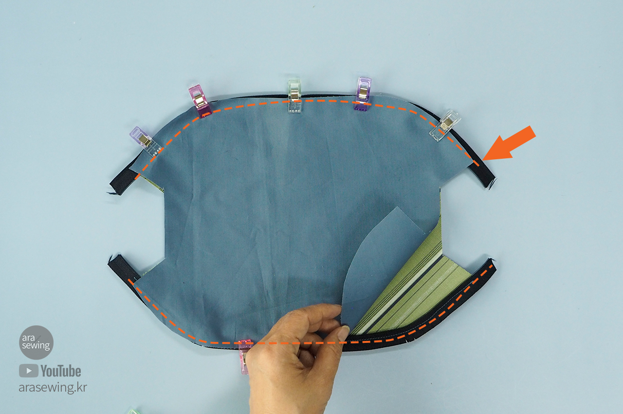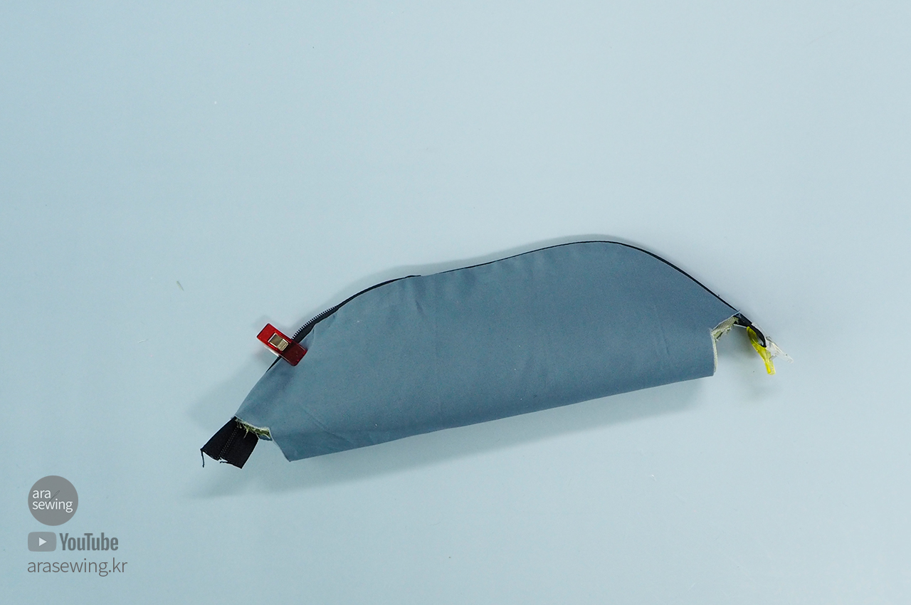 안쪽이 나오게 다시 뒤집습니다. 이때 양쪽 지퍼 이빨이 벌어지지 않게 조심해서 뒤집습니다. 지퍼 이빨 중간에 손바느질로 고정하고 하는 것도 좋아요.