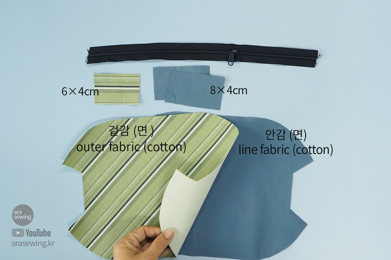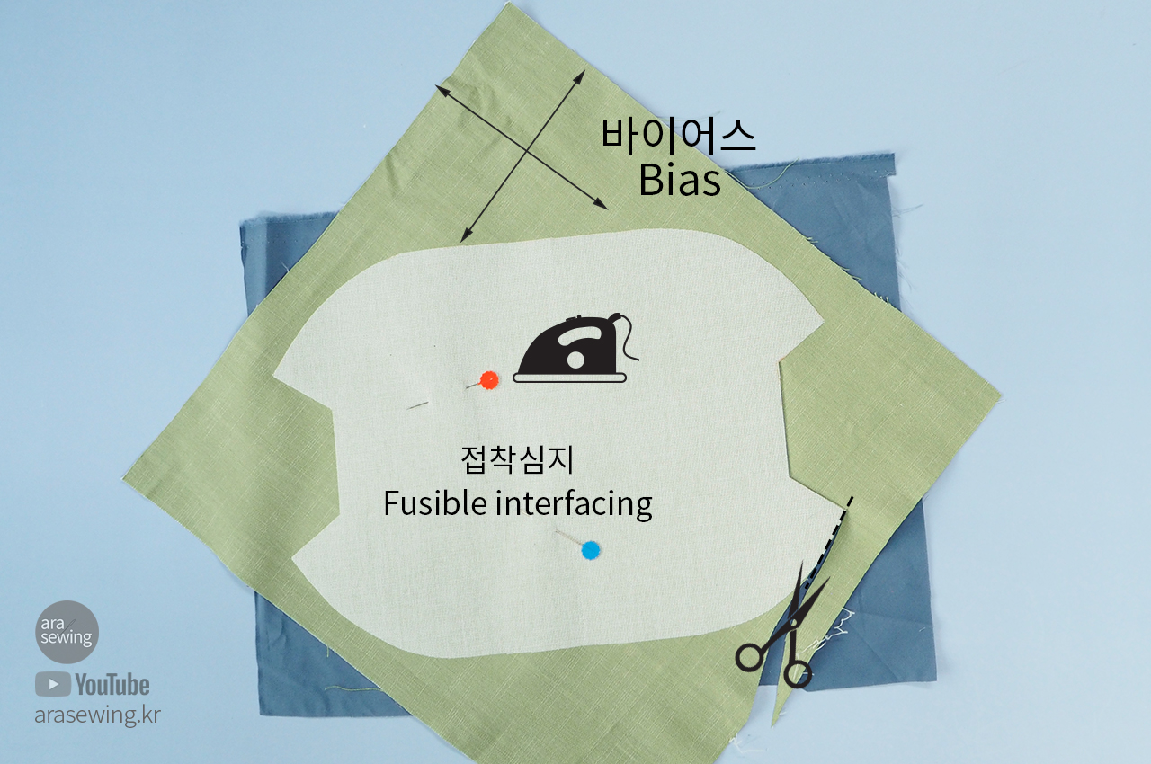 겉감을 바이어스 방향으로 놓고 겉감의 안쪽에 접착심지를 붙입니다. 겉감 밑에 안감을 겹치고 겉감과 안감을 재단합니다. 패턴의 밑에 곬선을 제외하고는 시접 1cm입니다.