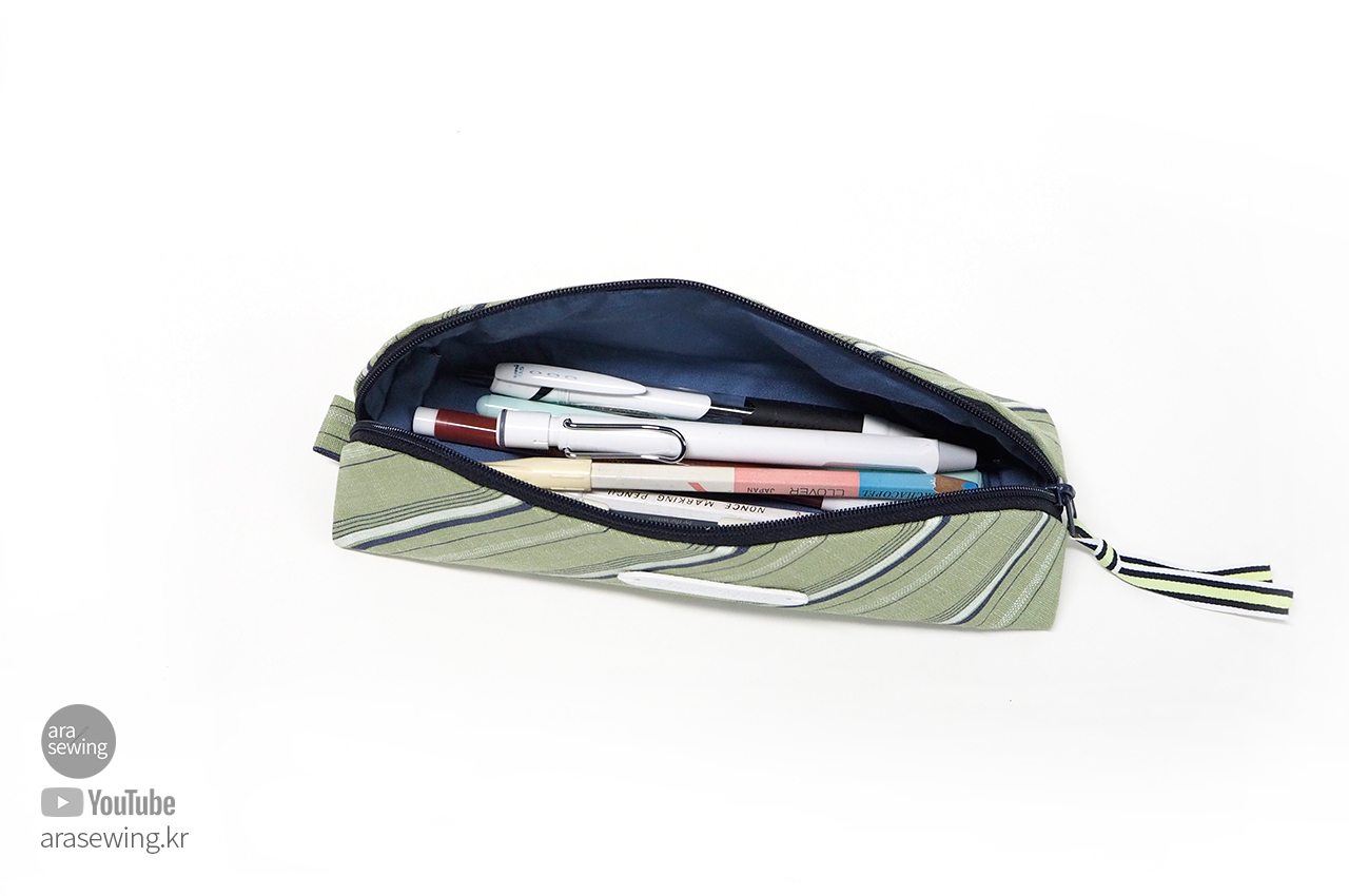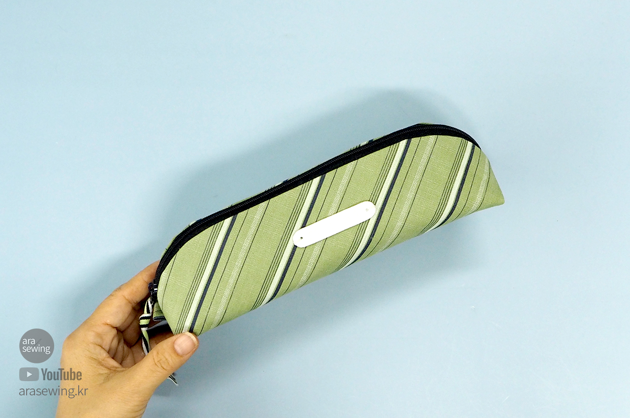 시접을 감싸는 원단은 양쪽 끝을 접어서 필통 끝에 고정하고 박음질합니다.
