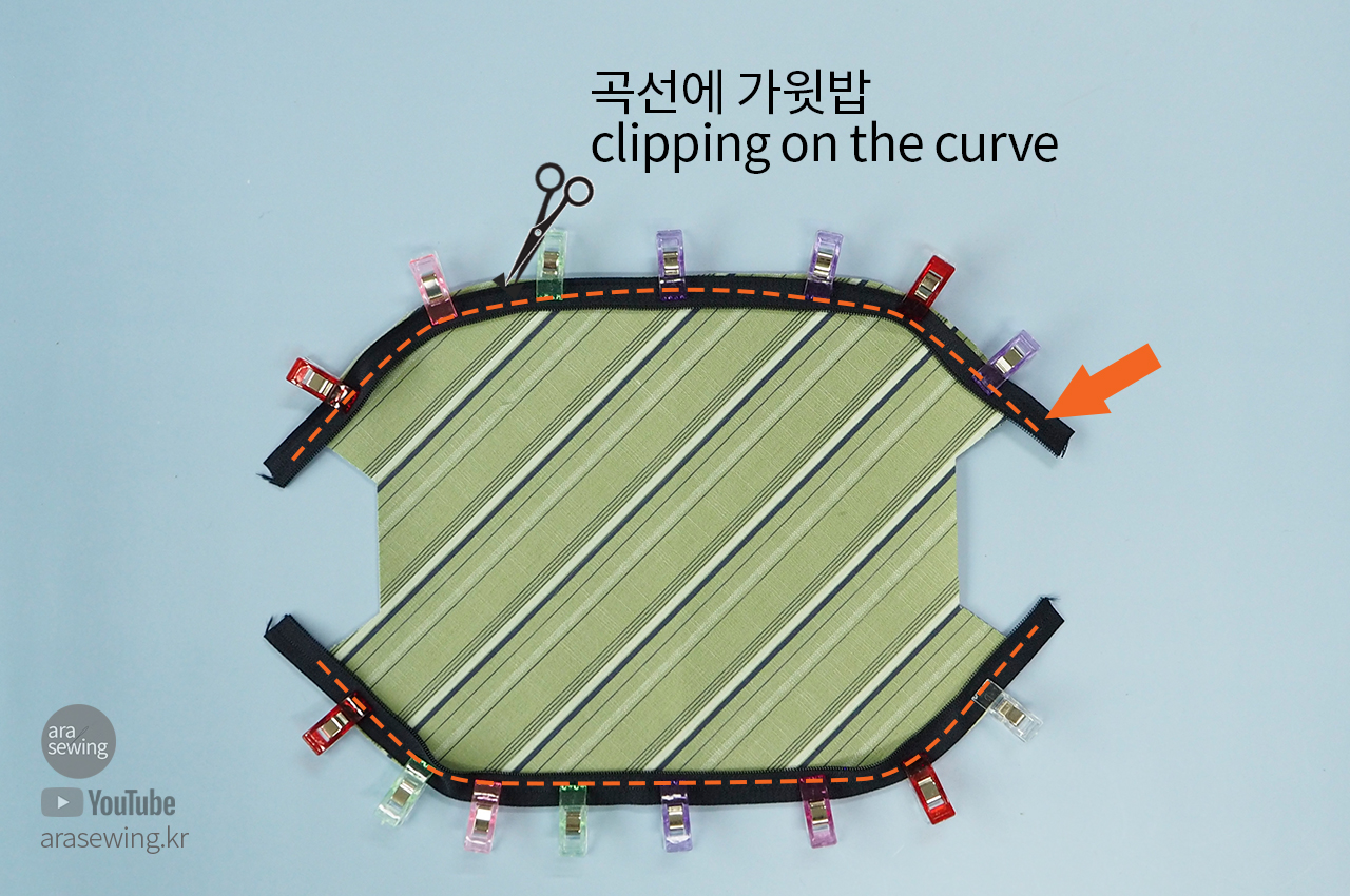 지퍼를 가운데를 갈라서 겉감의 겉면에 지퍼의 뒷면을 대고 박음질을 합니다. 곡선 부분에는 가윗밥을 주어 곡선을 부드럽게 합니다.