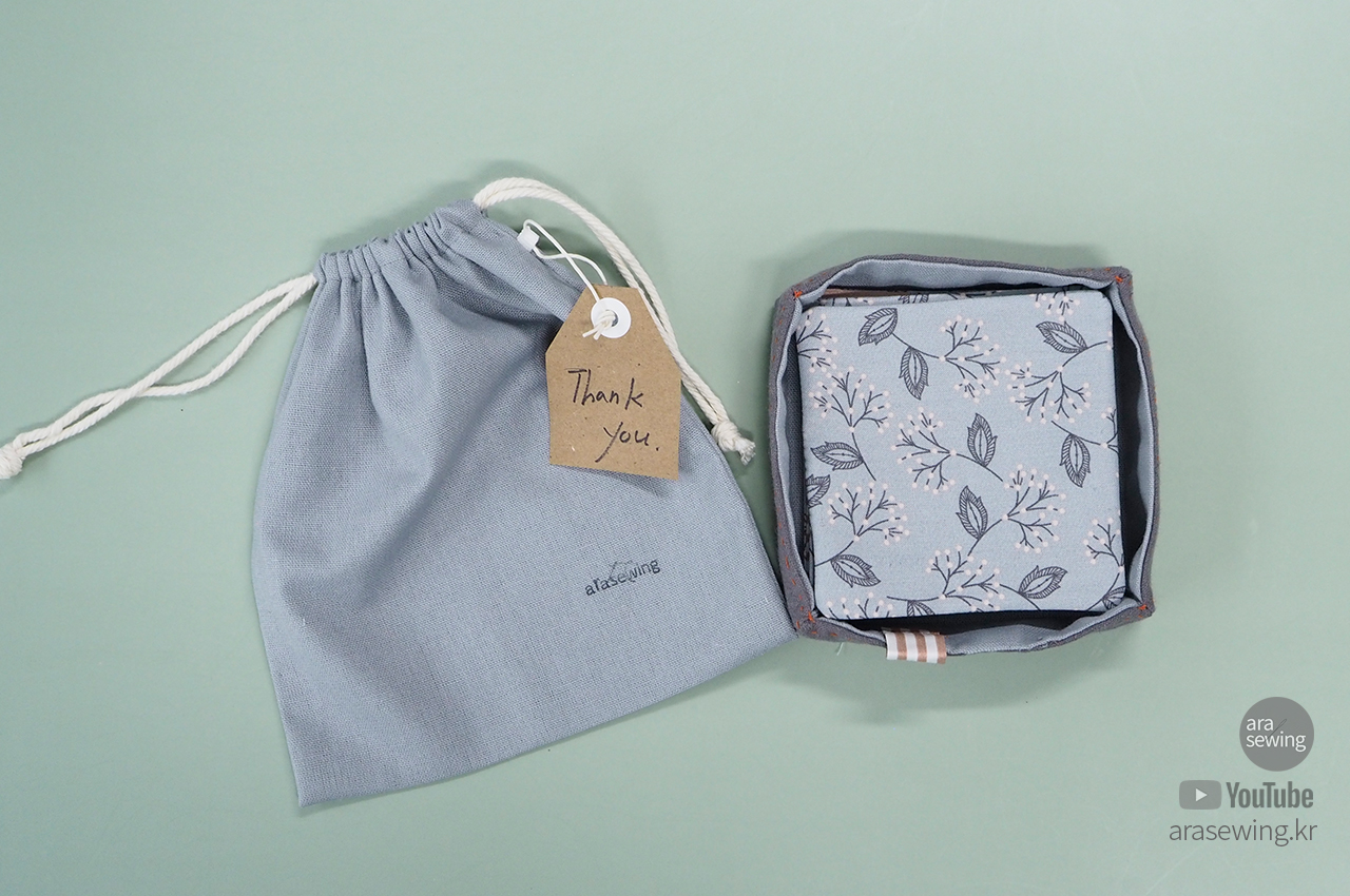 연말이 되면 주변 사람들에게 작은 선물 할 일이 생기게 됩니다. 바느질을 취미로 해서 그런지 이왕이면 기성품 같지 않게, 대량 생산된 느낌이 아닌, 뭔가 그래도 정성이 들어간 선물이면 좋겠다고 생각했습니다. 호불호가 별로 없는 티코스터 정도면 무난하지 않을까 생각해서 만들었어요. 나중에 파우치로 쓸 수 있도록 스트링 주머니로 포장을 대신했습니다.