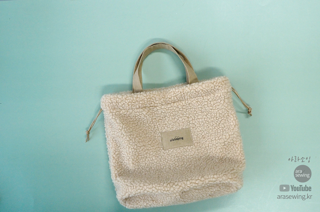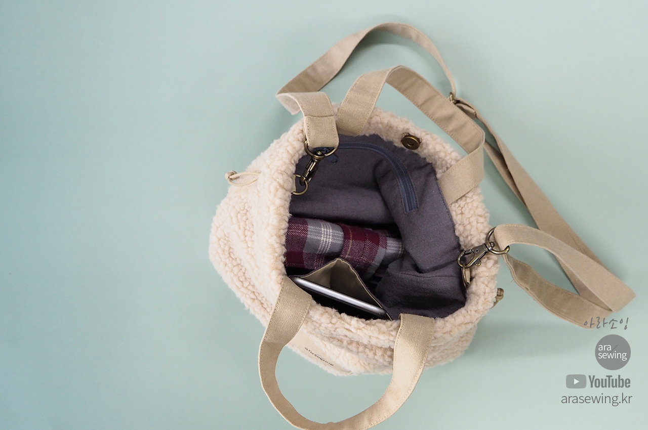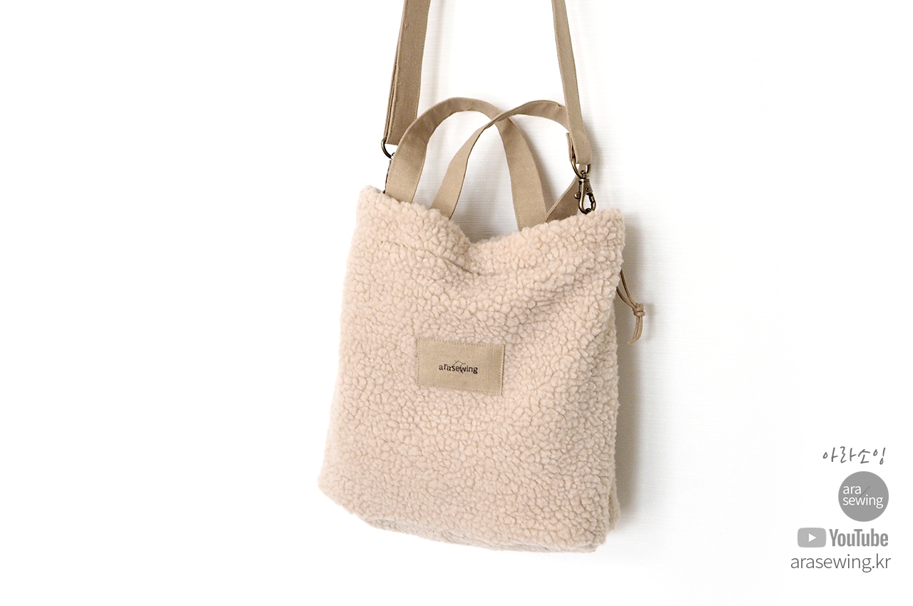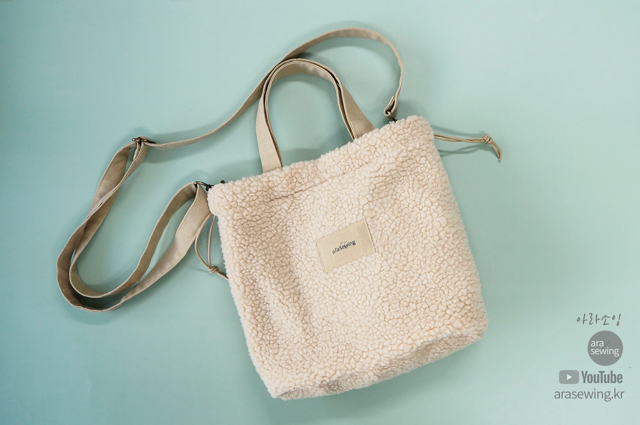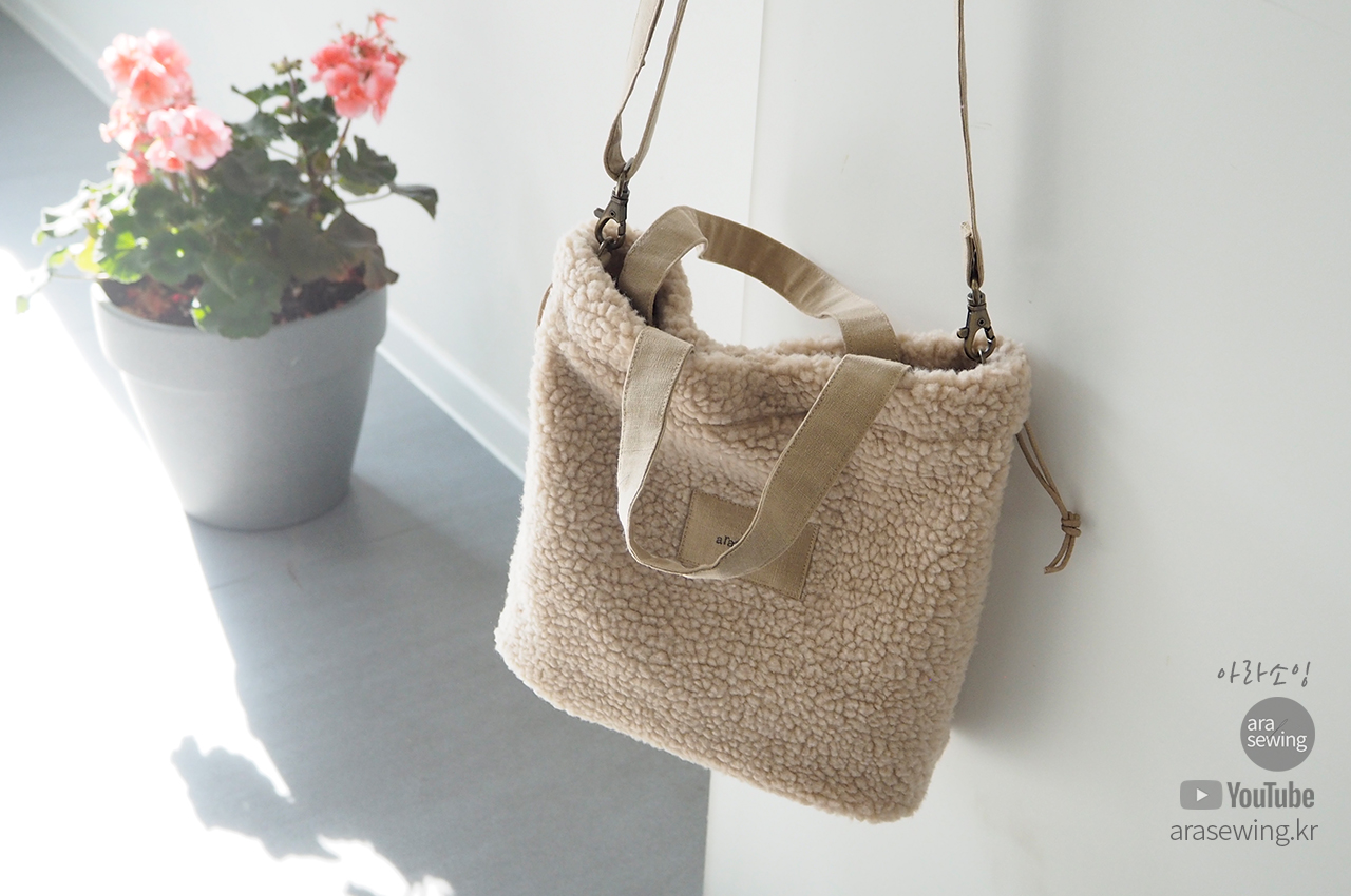 요즘 많이 보이는 플리스 원단으로 가방을 만들었습니다. 뽀글뽀글 털이 폭신하고 귀여운 가방입니다. 가방은 손으로 들어도 되는 토트백이 되기도 하고 스트랩을 연결하면 크로스백이 되기도 합니다. 이 원단은 쓰임새가 많은 원단으로 의류나 소품 등 여러곳에 쓰이지만 가정용 재봉틀로 바느질 하기에는 어려움이 있지요. 바로 니트의 특성인 신축성 때문입니다. 일반 우븐을 박음질 할 때 사용 하는 바늘을 사용하면 바늘땀이 뜨면서 잘 안박힙니다. 이런 니트류를 재봉 할 때는 볼포인트 바늘을 쓰면 바늘땀이 뜨거나 봉제가 안되는 걸 보완할 수 있습니다. 적당한 접착심지와 바늘을 사용하여 플리스 원단을 바느질 해 보세요.