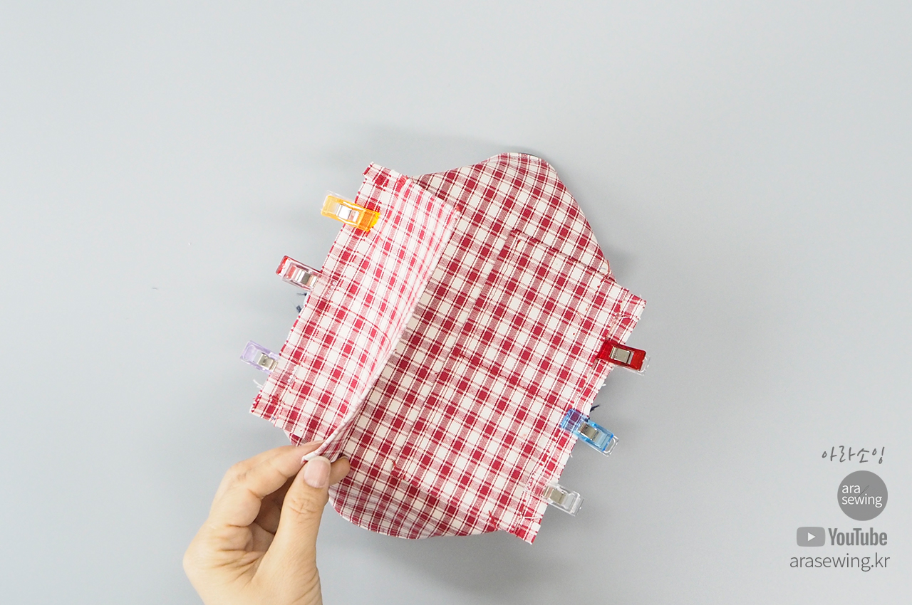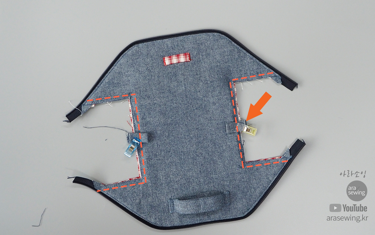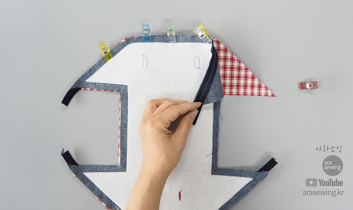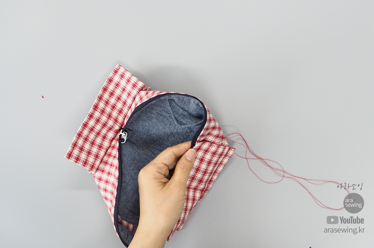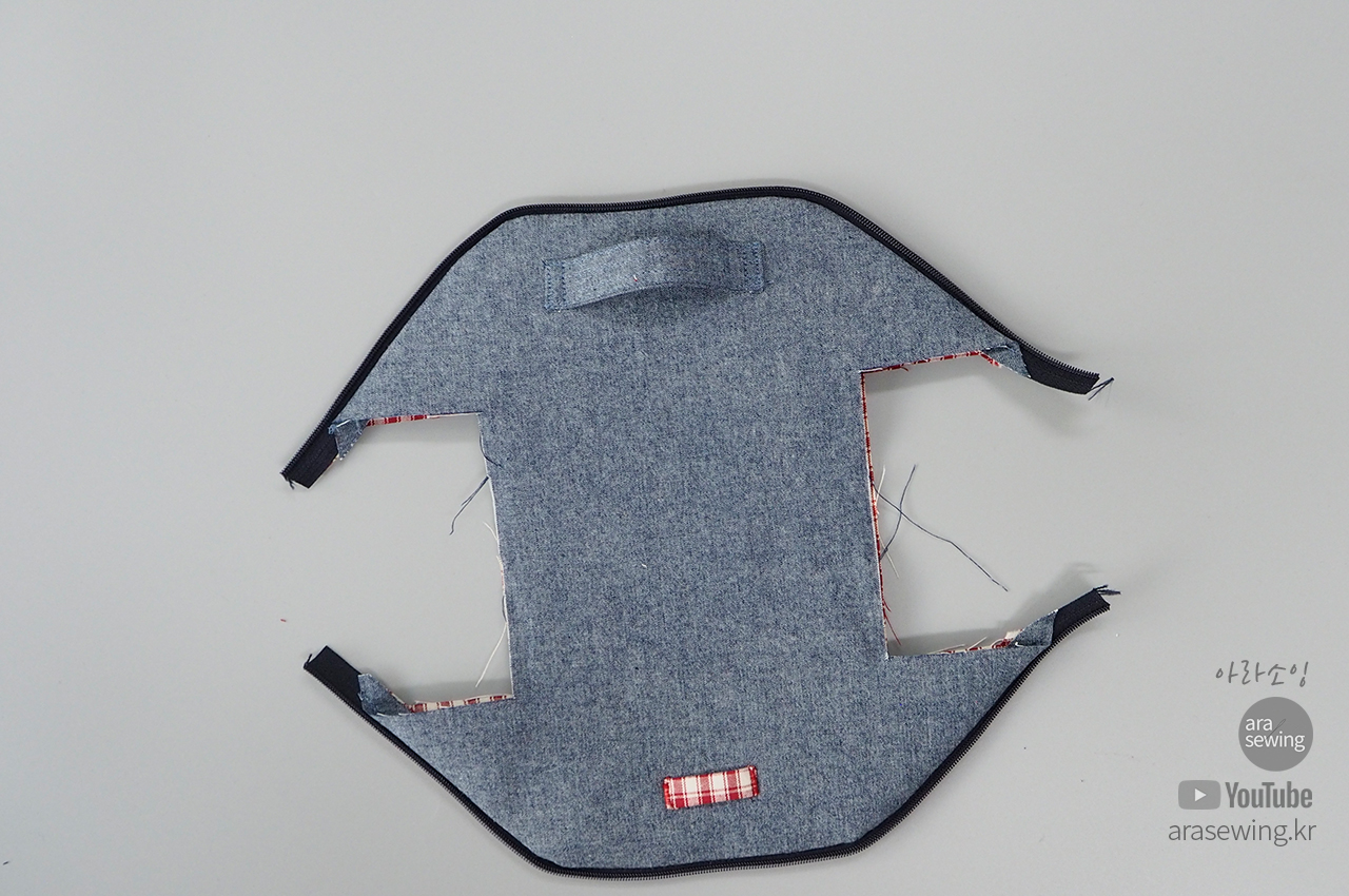 안감이 보이게 뒤집은 후에 지퍼를 벌려 양쪽에 일자로 납작하게 마주대고 박음질로 고정합니다.