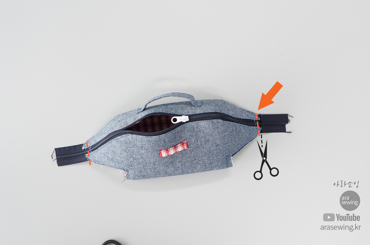 벌어지지 않게 고정합니다(동영상 참조) 그 후에, 지퍼의 끝을 완성선에 맞게 잘라냅니다.