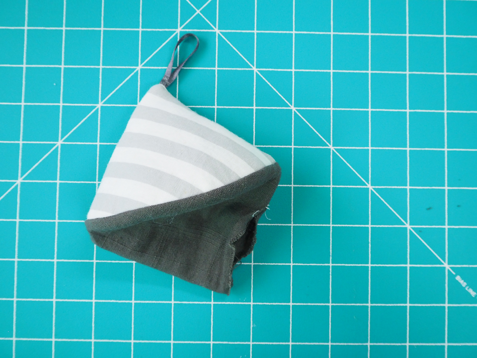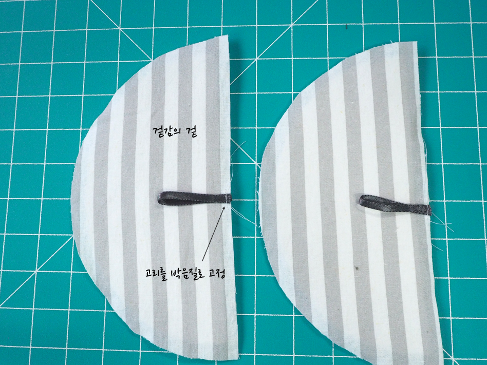 4. 겉감의 겉에 중심에 고리를 박음질로 고정합니다.