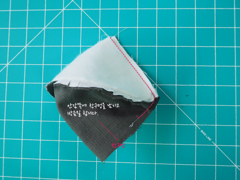 7. 그림처럼 창구멍을 남기고 박음질합니다.