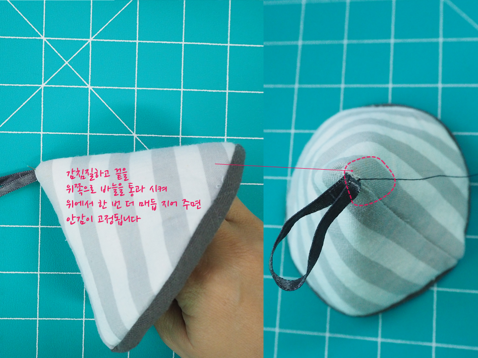 4. 겉감의 겉에 중심에 고리를 박음질로 고정합니다.